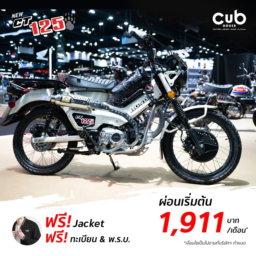 ส่วนไบค์เกอร์สายลุยก็มีอีกรุ่นคุ้มค่าคือ New Honda CT125 ราคาแนะนำ 88,900 บาท จองตอนนี้ได้โปรโมชัน รับเสื้อแจ็คเก็ต ทะเบียน และ พ.ร.บ. โดยผ่อนเริ่มต้นที่ 1,911 บาทต่อเดือน และปิดท้ายด้วยแนวคลาสสิกสุดหรูของ Honda C125 ที่มาพร้อมราคาแนะนำ 89,600 บาท ผ่อนเริ่มต้นเพียง 1,931 บาทต่อเดือน พร้อมของแถมเสื้อแจ็คเก็ต ทะเบียน และ พ.ร.บ.