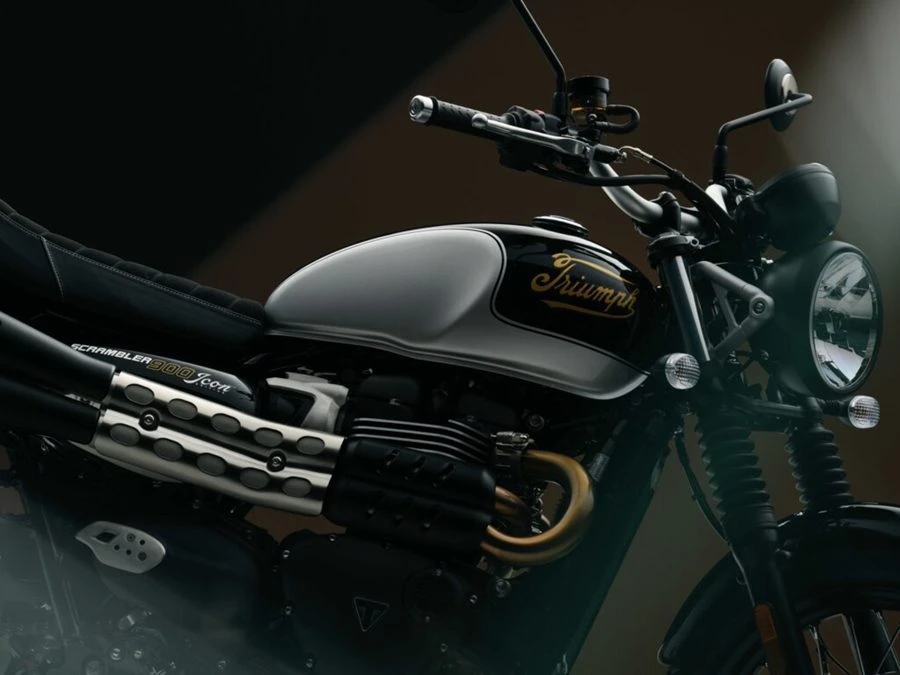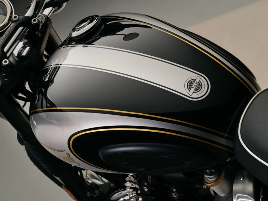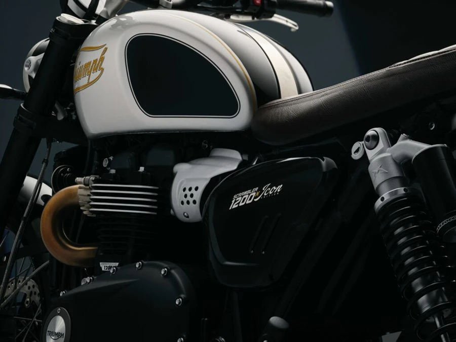 Scrambler 900 Icon Edition มาพร้อมกับสี Sapphire Black และสี Aluminium Silver ที่ถ่ายทอดจิตวิญญาณแห่งการผจญภัย เน้นย้ำถึงจุดยืนของการขับขี่ที่โดดเด่น สีถังน้ำมันเชื้อเพลิงที่สดใส แถบสีอลูมิเนียมสีเงินพร้อมกราฟิกไอคอนเฉพาะ และตราสัญลักษณ์ หรือ โลโก้ Triumph สีทองอันเป็นเอกลักษณ์ประจำปี 1907 ที่สร้างความแตกต่างอย่างโดดเด่นที่เข้ากันกับบังโคลนสี Sapphire Black ในขณะที่ลายเส้นบนตัวถังที่วาดด้วยมือ ช่วยเสริมให้รูปลักษณ์ของรถดูโดดเด่นยิ่งขึ้น ทำให้เป็นตัวเลือกที่น่าสนใจสำหรับการขับขี่ในเมืองและออฟโรด