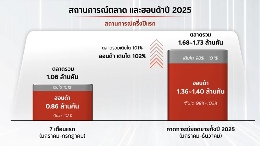 มร.ยูอิจิ ชิมิซุ ประธานกรรมการบริหารบริษัท ไทยฮอนด้า จำกัด กล่าวเปิดงาน “ในช่วงครึ่งปีที่ผ่านมา ไทยฮอนด้าได้เผชิญทั้งความท้าทายและโอกาส พร้อมก้าวผ่านช่วงเวลาสำคัญไปพร้อมกับลูกค้าและพันธมิตรทุกฝ่าย ในช่วงครึ่งปีแรก ยอดขายรวมของตลาดรถจักรยานยนต์อยู่ที่ 1.06 ล้านคัน หรือ เพิ่มขึ้น 101% เมื่อเทียบกับปีที่ผ่านมา ขณะที่ยอดขายของไทยฮอนด้าอยู่ที่ 0.86 ล้านคัน หรือ เติบโต 102% เมื่อเทียบกับช่วงเวลาเดียวกันของปีก่อน สำหรับตลาดรวมตลอดปี 2568 เราคาดการณ์เหมือนตอนต้นปีว่าจะมียอดขายรวมอยู่ที่ 1.68 ถึง 1.73 ล้านคัน หรือ เติบโตประมาณ 101% ส่วนไทยฮอนด้าตั้งเป้ายอดขายไว้ที่ 1.36 ถึง 1.40 ล้านคัน หรือราว 102% เมื่อเทียบกับปีก่อน ซึ่งสะท้อนถึงความเชื่อมั่นของผู้บริโภคที่มีต่อผลิตภัณฑ์และบริการของฮอนด้าอย่างต่อเนื่อง”