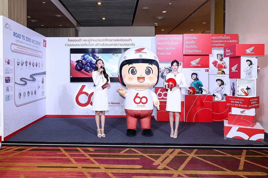 เนื่องในโอกาสพิเศษครบรอบ 60 ปี นี้ ไทยฮอนด้าได้จัดตั้ง โครงการบริจาคหมวกกันน็อก จำนวน 60,000 ใบ มูลค่า 60 ล้านบาท จัดขึ้นภายใต้แนวคิด 60 ปี ไทยฮอนด้า ขับขี่ปลอดภัย เพื่อสังคมไทยที่ยั่งยืน โดยร่วมมือกับหน่วยงานภาครัฐ สถาบันการศึกษา เราจะส่งมอบหมวกกันน็อก 77 จังหวัดทั่วประเทศ พร้อมเดินหน้าเคียงข้างสังคมไทย ด้วยความมุ่งมั่นในการรณรงค์เรื่องความปลอดภัย และสร้างความตระหนักรู้ให้กับคนไทยทุกคน เพื่อร่วมกันขับเคลื่อนสังคมไทยให้ปลอดภัย และก้าวสู่เป้าหมายของการเป็นสังคมที่อุบัติเหตุเป็นศูนย์