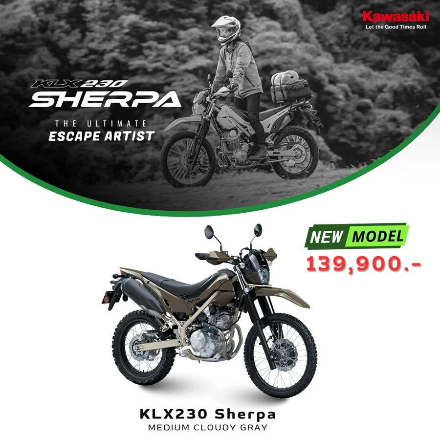 พร้อมสีใหม่ Medium Cloudy Gray สีเทาคล้ายวันฟ้าหม่น ทำให้ KLX230 Sherpa คันนี้เหมาะอย่างยิ่งที่จะเป็นคู่หูออกเดินทางเพื่อหลีกหนีไปยังโลกแห่งธรรมชาติที่ใจใฝ่หา มาพร้อมกับราคาใหม่สุดพิเศษ 139,900 บาท พร้อมคูปองเงินสด 5,000 บาท และฟรีประกันรถหาย 1 ปี พร้อมทะเบียน พรบ. บอกเลยว่าพลาดไม่ได้จริงๆ