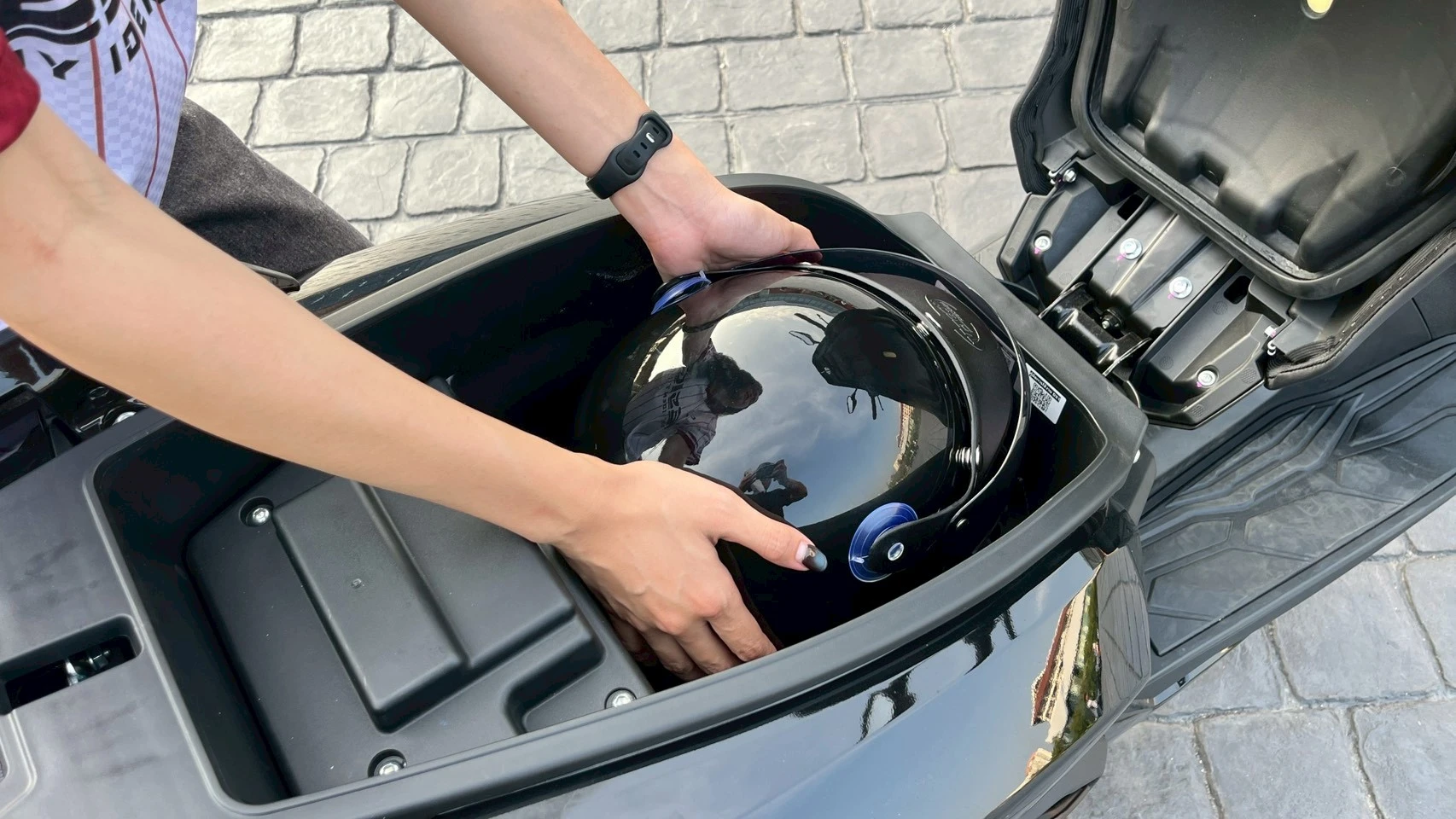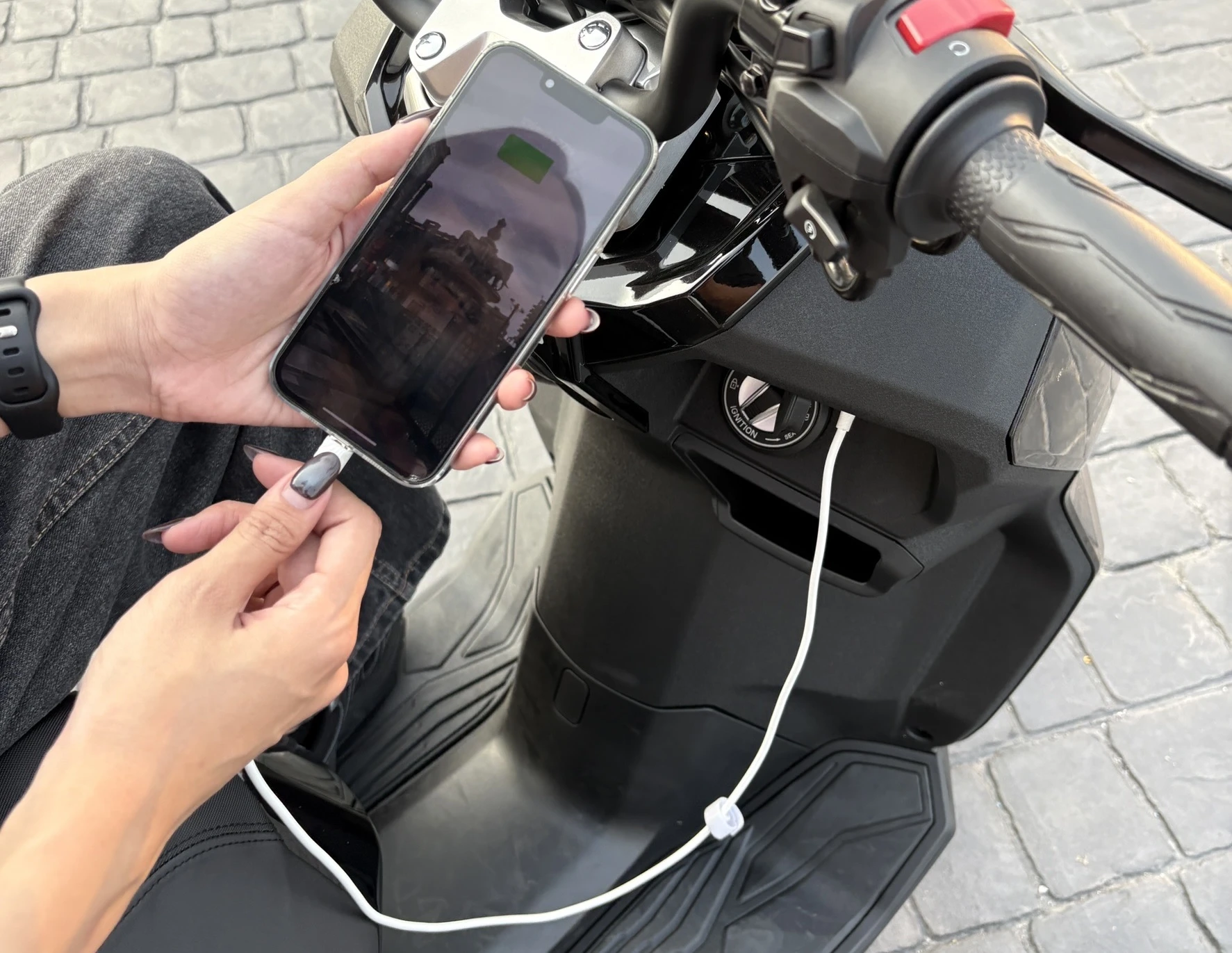ฟังก์ชันที่เหมาะกับการขับขี่ในเมืองมากอีกอย่างคือ ก้านล็อคเบรกที่แฮนด์ซ้ายเป็นเหมือน “เบรกมือ” ใช้จอดชั่วคราว เวลาอยู่บนเนินหรือทางชันได้เป็นอย่างดี และยังมีช่องจ่ายไฟ USB-C และที่ใส่ของฝั่งซ้ายและขวา ที่ไม่ต้องกลัวโทรศัพท์แบตฯ หมดตลอดการเดินทาง สายโซเชียลอย่างแก้มชอบมากค่ะ