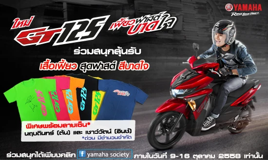 ร่วมสนุกในกิจกรรมตอบคำถาม Yamaha GT125 ลุ้นรับ เสื้อ เฟี้ยว สุดฟาสต์ สีบาดใจ พิเศษพร้อมลายเซ็น "ต้น นฤบดินทร์" และ "อินช์ เชาว์วัตน์" สองพรีเซ็นเตอร์สุดเฟี้ยว ของ Yamaha GT125 โดยร่วมสนุกตอบคำถามกันได้ ระหว่างวันที่ 9-16 ตุลาคมนี้ ทาง Facebook Page Yamaha Society www.facebook.com/YamahaSociety นะครับ