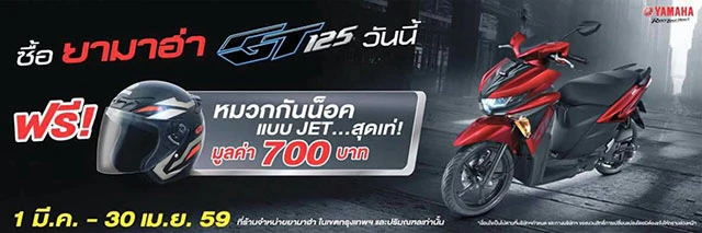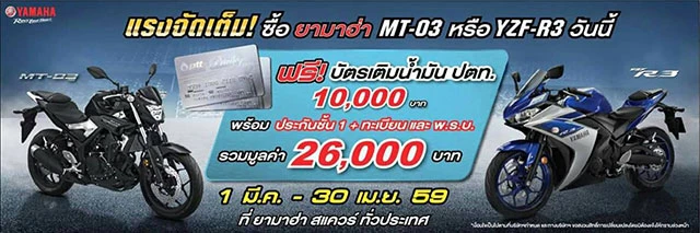 บริษัท ไทยยามาฮ่ามอเตอร์ จำกัด กระตุ้นยอดจำหน่ายส่งท้ายไตรมาสแรกด้วยโปรโมชั่นสุดเร้าใจ โดยผู้ที่ซื้อรถจักรยานยนต์ยามาฮ่า YZF-R3 หรือ MT-03 จะได้รับบัตรเติมน้ำมันมูลค่า 10,000 บาท พร้อมประกันภัยชั้น 1 + ทะเบียน + พ.ร.บ. รวมมูลค่า 26,000 บาท ฟรีทันที!! ที่ยามาฮ่า สแควร์ทั่วประเทศ และสำหรับผู้ที่ซื้อรถจักรยานยนต์ยามาฮ่า GT125 จะได้รับหมวกกันน็อคแบบ JET สุดเท่ มูลค่า 700 บาท ฟรี!! ที่ร้านจำหน่ายยามาฮ่า ในเขตกรุงเทพฯ และปริมณฑลเท่านั้น โปรโมชั่นสุดเร้าใจนี้สำหรับผู้ที่ซื้อรถจักรยานยนต์ยามาฮ่ารุ่นดังกล่าว ตั้งแต่วันที่ 1 มีนาคม - 30 เมษายน 2559 เท่านั้น ผู้ที่สนใจสามารถสอบถามรายละเอียดเพิ่มเติมได้ที่ร้านผู้จำหน่ายรถจักรยานยนต์ยามาฮ่า หรือ ยามาฮ่า สแควร์ ทั่วประเทศ