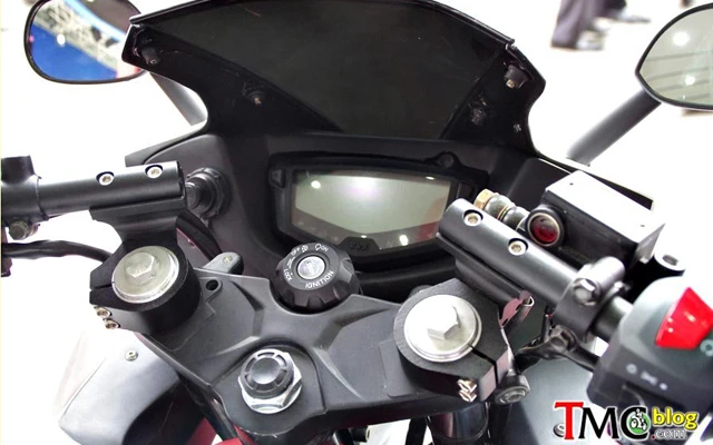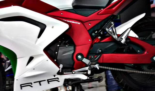 RTR200 มาในธีมสี white-burgundy ตัวรถดีไซน์คมชัด ระบบเบรกด้านหน้าใช้ดิสก์เบรกคู่, เคสสำหรับป้องกัน fork, กระจกบังลมหน้ารถ และถังน้ำมันเชื้อเพลิงแข็งพิเศษ พร้อมหน้าจอแบบ Full Digital