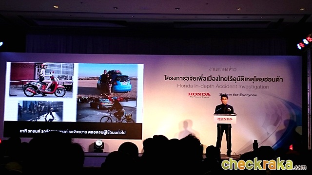 มร.อาเบะ กล่าวว่า "ฮอนด้ามีความมุ่งมั่นที่จะสร้างสรรค์สังคมปลอดอุบัติเหตุ" เพื่อให้ผู้ใช้รถใช้ถนนมีความสุขจากการใช้ยานยนต์ ทั้งนี้อัตราการเกิดอุบัติเหตุในภูมิภาคเอเชียถือเป็นเรื่องเร่งด่วนที่จะต้องแก้ไขโดยเร็ว โดยในส่วนของผู้ผลิตและจำหน่ายยานยนต์ ฮอนด้าจะทำการศึกษาวิเคราะห์เพื่อค้นหาปัจจัยต้นเหตุของการเกิดอุบัติเหตุเพื่อนำไปสู่การแก้ปัญหาอย่างตรงจุดและเหมาะสมต่อไป เราเชื่อมั่นว่าโครงการวิจัยอุบัติเหตุในประเทศไทยครั้งนี้ จะเป็นโครงการนำร่องที่สามารถเพิ่มพูนองค์ความรู้ต่างๆ ในการพัฒนาเทคโนโลยีและความรู้ด้านความปลอดภัยบนท้องถนน รวมทั้งช่วยลดอัตราการเกิดอุบัติเหตุในประเทศไทยและภูมิภาคได้อย่างแน่นอน"