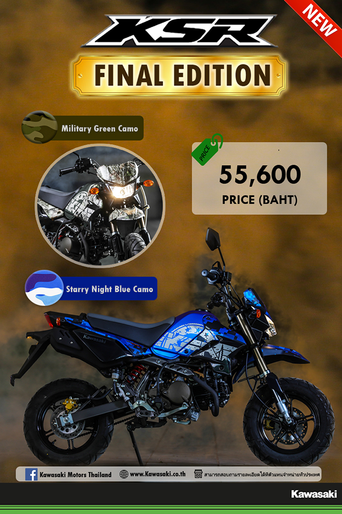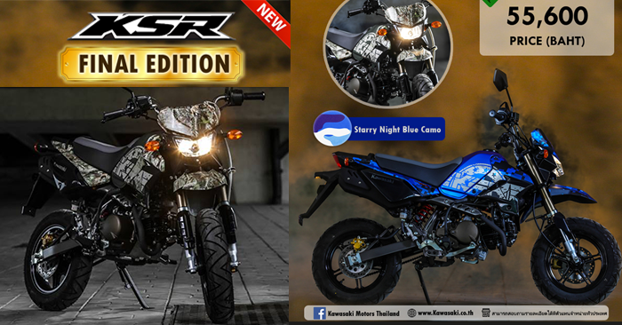 จักรยานยนต์มินิไบค์สไตล์สปอร์ต KSR "Final Edition" รถจักรยานยนต์ที่คูลที่สุดแห่งยุค กับความเรียบง่ายและทนทานของเครื่องยนต์ 1 สูบ 4 จังหวะที่ระบายความร้อนด้วยอากาศ ขนาด 111 ซีซี พร้อมด้วยการออกแบบทางวิศวกรรมและรูปลักษณ์ที่สวยงาม ทำให้ KSR มีสมรรถนะที่ยอดเยี่ยมและความงดงามที่น่าจดจำ ด้วยจำนวนจำกัด สำหรับแฟน ๆ และผู้ที่ชื่นชอบ โอกาสสุดท้ายที่จะได้สัมผัสกับประสบการณ์ความสนุกสนานบนท้องถนนด้วยรถจักรยานยนต์คู่ใจ ที่ขี่สนุก และโดดเด่นสะดุดสายตา กับ KSR "Final Edition" ซึ่งเป็นรุ่นสุดท้ายในไลน์การผลิตด้วยลวดลายกราฟิก ล่าสุดมาในสี Starry Night Blue Camo และ Military Green Camo โดยมีราคาอยู่ที่ 55,600 บาท