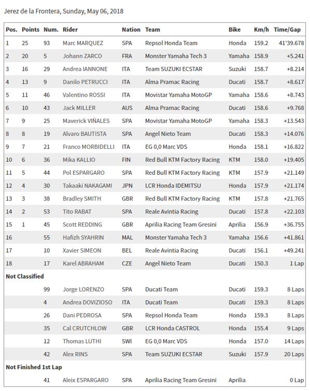 ผลการแข่งขันสนามที่ 4 เป็น Maquez จาก Repsol Honda Team คว้าอันดับ 1 ไปได้แบบสบายๆ ส่วนอันดับ 2 เป็น Zarco จากทีม Monster Yamaha Tech 3 ตามมาด้วยอันดับ 3 Iannone จาก Team Suzuki Ecstar