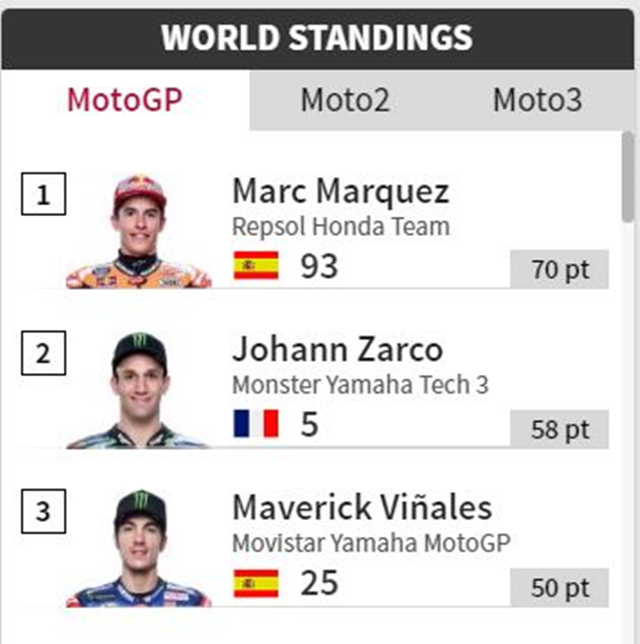 ทางด้านคะแนนสะสมกลุ่มทีมอิสระ Zarco จากทีม Monster Yamaha Tech 3 เป็นผู้นำด้วยคะแนน 58 แต้ม Crutchlow เป็นอันดับ 2 ด้วยคะแนน 38 แต้ม อันดับ 3 เป็นของ Miller จากทีม Alma ParmacRacing