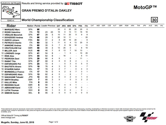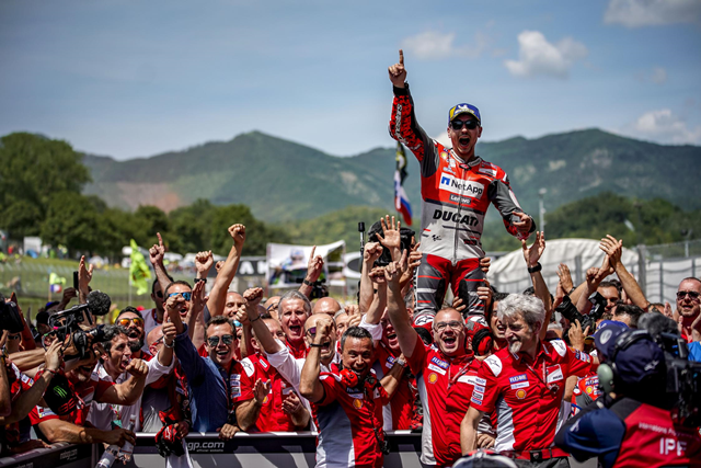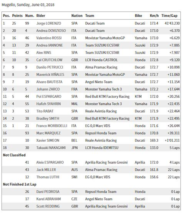 หลังจากจบ 23 รอบการแข่งขันในสนาม Autodromo del Mugello ก็เป็นแฟนๆ Ducati Team ได้เฮ เมื่อสามารถคว้าตำแหน่ง 1-2 ไปได้สำเร็จโดย Lorenzo ได้ตำแหน่งที่ 1 ถือเป็นการปลดล็อกการคว้าแชมป์แรกได้สำเร็จหลังจากย้ายมาสังกัด Ducati หลังจากมีเสียงวิจารณ์อย่างหนักถึงผลงานที่ผ่านมาตั้งแต่ย้ายมาร่วมทีมกับ Dovizioso ส่วนอันดับ 3 Rossi จาก Movistar Yamaha MotoGP ยังรักษาตำแหน่งเอาไว้ได้จนถึงเส้นชัย