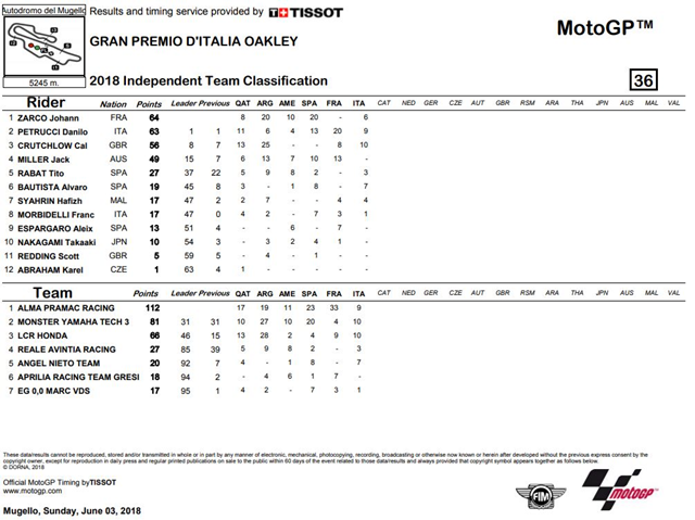 ฟากนักแข่งจากทีมอิสระ คะแนนสูสีเมื่อ Petrucci ทำผลงานคงเส้นคงวาไล่เก็บแต้มจนจบการแข่งขันสนามนี้ มีแต้มตาม Zarco ผู้นำอยู่เพียง 1 แต้มเท่านั้น ด้านส่วนคะแนนสะสมประเภททีมอิสระยังคงเป็น ทีม ALma Pramac Racing ที่ยังคงนำMonster Yamaha Tech 3 อยู่ถึง 31 แต้ม