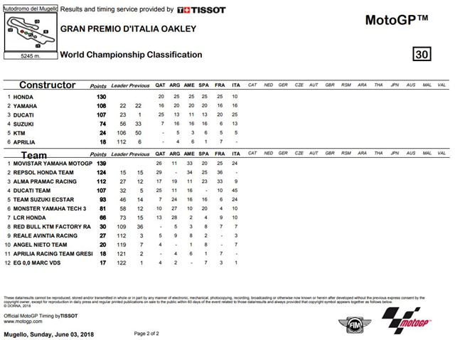 คะแนนสะสมผู้ผลิตยังเป็น Honda ที่เป็นผู้นำด้วยคะแนน 130 แต้ม แต่คะแนนสะสมประเภททีมนั้นมีการเปลี่ยนแปลง หลังจากที่ 2 นักแข่งประจำทีม Repsol Honda Team ไร้แต้ม ก็ทำให้ ทีม Movistar Yamaha MotoGP นั้นแซงมาเป็นผู้นำด้วยคะแนน 139 แต้ม ทิ้งห้าง Repsol Honda Team ไป 15 แต้ม