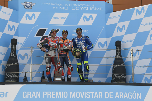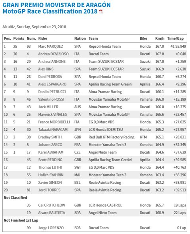 แต่ในช่วงท้ายๆ ของการแข่งขันก็ได้เวลาที่ Marquez จะบู๊ เพื่อตำแหน่งชนะเลิศ มีจังหวะที่ โดนทั้ง Ducati และ Suzuki ประกบแย่งตำแหน่ง แต่ด้วยความคงเส้นคงวา และการปรับพฤติกรรมการขับขี่ที่สุขุมมากขึ้น สุดท้ายเลยเป็น Marquez ที่สามารถคว้าตำแหน่งแชมป์ประจำสนามที่ 14 ไปได้สำเร็จ ส่วน Dovizioso ได้อันดับที่ 2 และ Iannonoe ได้อันดับที่ 3