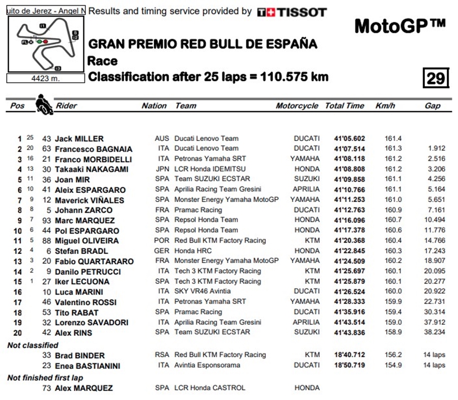 ท้ายที่สุด Miller นำห่างเกิน 1 วิเข้าเส้นชัยคว้าชัยใน Jerez ส่วน Bagnaia เข้าวินเป็นอันดับ 2 ทำให้คะแนนสะสมนำเป็นที่ 1 ด้านอันดับที่ 3 เป็นของ Morbidelli ทางด้าน Quartararo นั้นจบการแข่งขันในอันดับที่ 13 โดยโดน Miguel Oliveira จาก Red Bull KTM Factory Racing และ Stefan Bradl จาก Honda HEC แซงไปนั่นเอง นับเป็นครั้งแรกตั้งแต่การแข่งขัน Dutch TT ปี 2016 ที่ Miller ได้รับธงตาหมากรุกของการแข่งขัน MotoGP และเป็นครั้งแรกของ Ducati ใน Jerez