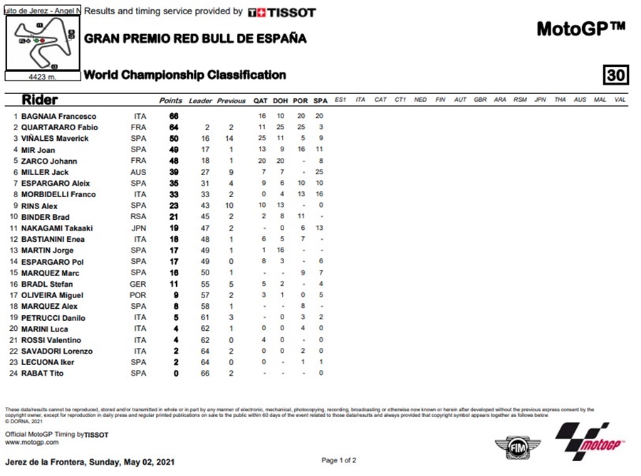 Bagnaia เป็นผู้นำคะแนนสะสมโดยผ่าน 3 สนาม มีคะแนน 66 แต้ม โดยมี Quartararo มีแต้มอยู่ 64 แต้ม ตามหลังห่าง 2 แต้ม ส่วนที่ 3 คือ Vinales มี 50 แต้ม ในที่สุดก็มีข่าวว่า Quartararo ที่อัดับร่วงลงมานั้นเกิดจากอาการบาดเจ็บ อาร์มปั๊ม โดยต้องมุ่งหน้าไปยังรายการ SHARK Grand Prix de France ที่สนาม Le Mans ในวันที่ 16 พฤษภาคม ที่จะถึงนี้