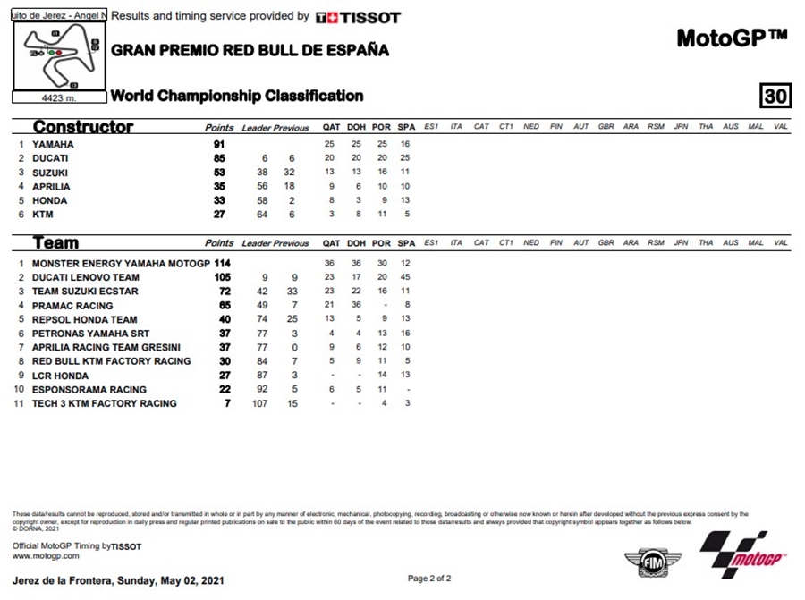 การแข่งขัน MotoGP ดำเนินมาถึงสนามที่ 3 ที่ Circuito de Jerez - Angel Nieto ในรายการ Gran Premio Red Bull de Espana ที่ Jack Miller จาก Ducati Lenovo Team ก็หักปากกาเซียน คว้าชัยชนะที่ไม่น่าจะเป็นไปได้ ด้านตัวเต็งอย่าง Fabio Quartararo จาก Monster Energy Yamaha MotoGP จากตำแหน่งโพล ร่วงไปจบการแข่งขันที่อันดับ 13 ส่วนอันดับ 2 ก็เป็นของ Francesco Bagnaia ทีมเมทคู่หูของ Miller ที่ขยับขึ้นมาเป็นผู้นำคะแนนสม ส่วนอันดับที่ 3 เป็นของ Franco Morbidelli จาก Petronas Yamaha SRT นักบิดจาก Yamaha เพียงคนเดียวที่ใช้รถปีเก่า