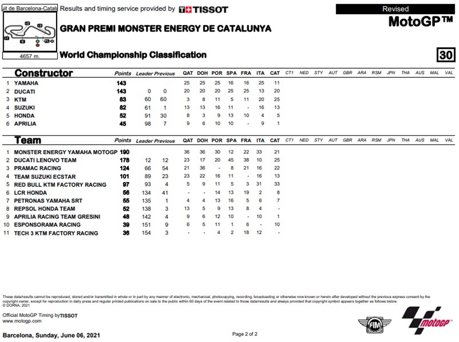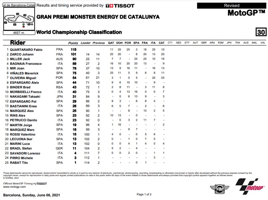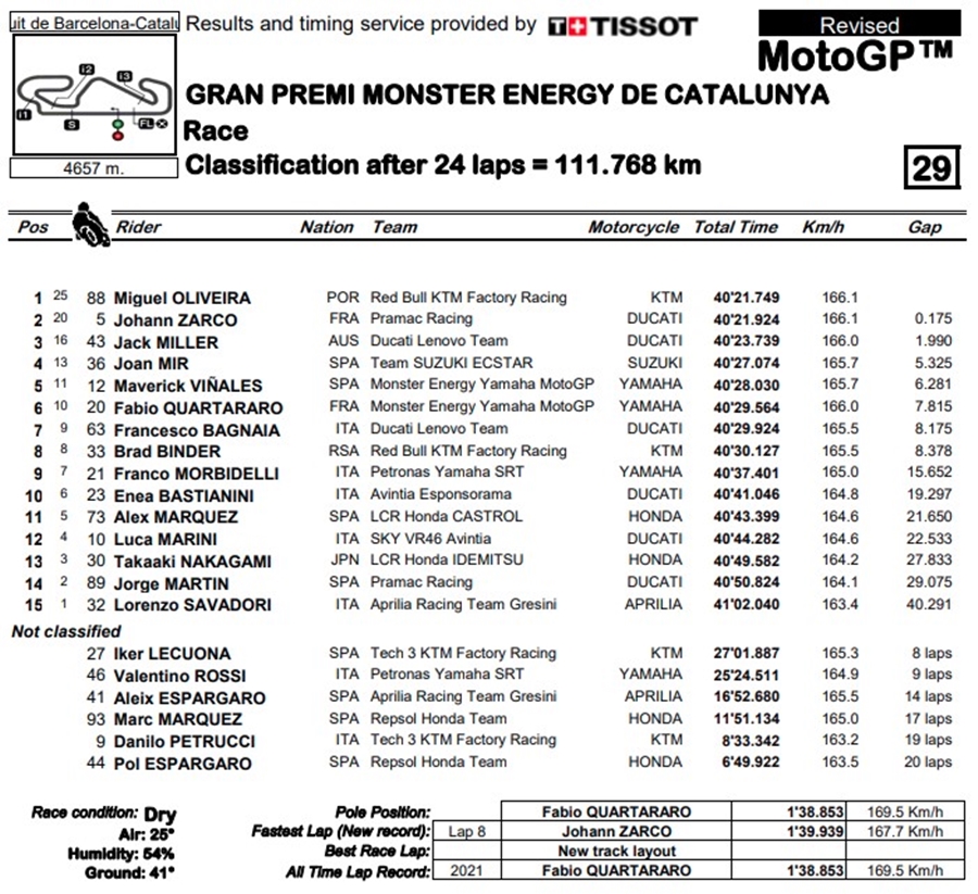 Miguel Oliveira นักบิดจากทีม Red Bull KTM Factory Racing คว้าชัยชนะได้อย่างสมบูรณ์แบบได้ในรายการ Gran Premi Monster Energy de Catalunya ที่สนาม Circuit de Barcelona-Catalunya ด้านอันดับที่ 2 เป็นของ Johann Zarco จากทีม Pramac Racing ส่วนอันดับที่ 3 เป็นของ Jack Miller จาก Ducati Lenovo Team ที่ได้ปรับตำแหน่งมาแทน Fabio Quartararo จากทีม Monster Energy Yamaha MotoGP ผู้นำคะแนนสะสมชิงแชมป์โลก ที่ถูกปรับโทษทำให้ต้องพลาดตกโพเดี้ยมไปในที่สุด