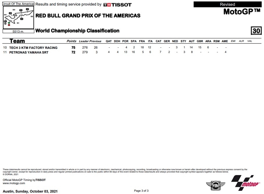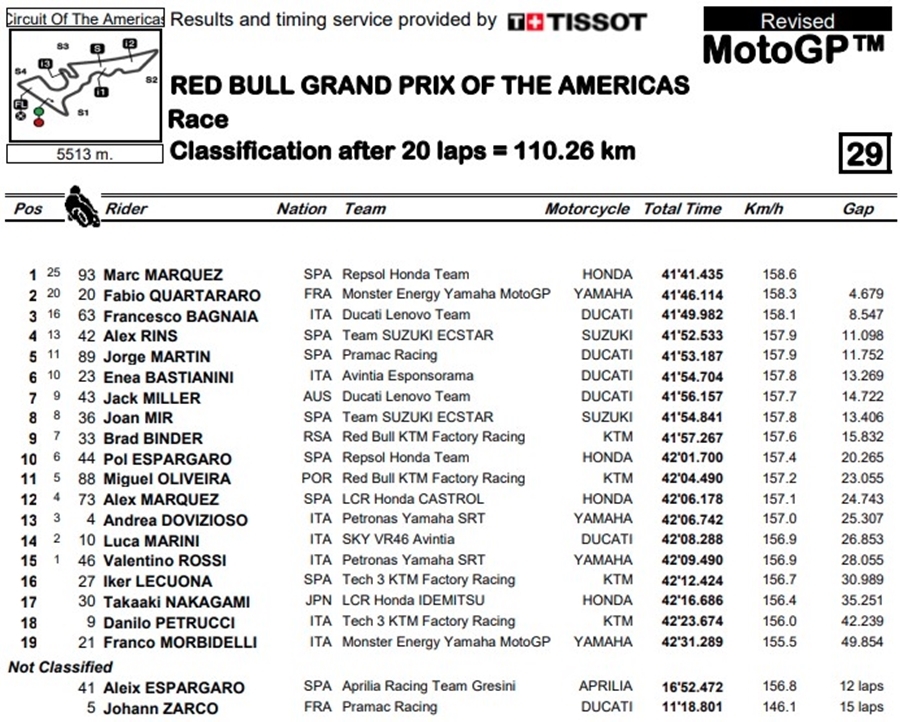 ในที่สุด Marc Marquez ก็กลับมาคว้าแชมป์อีกครั้งในฤดูกาล 2021 และเป็นแชมป์ครั้งที่ 7 ใน COTA (Circuit of The Americas) ของ Repsol Honda Team ด้าน Quartararo จบในอันดับ 2 และ Bagnaia จบในอันดับ 3 ส่วน Rins สามารถจบในอันดับที่ 4 เนื่องจาก Martin โดน LLP ทำให้จบในอันดับที่ 5