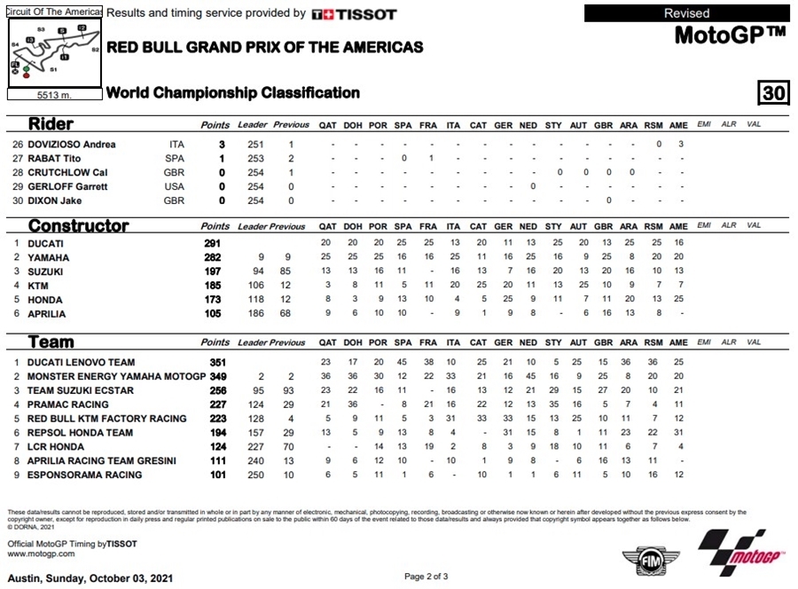 หลังจบการแข่งขันที่ COTA Quartararo นั้นมีคะแนนสะสมนำห่างออกไปเป็น 52 แต้ม นั้นหมายถึงเขาสามารถคว้าแชมป์ปี 2021 ได้ในครั้งต่อไปที่ Misano ในรายการ Gran Premio Nolan del Made in Italy e dell'Emilia-Romagna ที่สนาม Misano World Circuit Marco Simoncelli ในอิตาลี