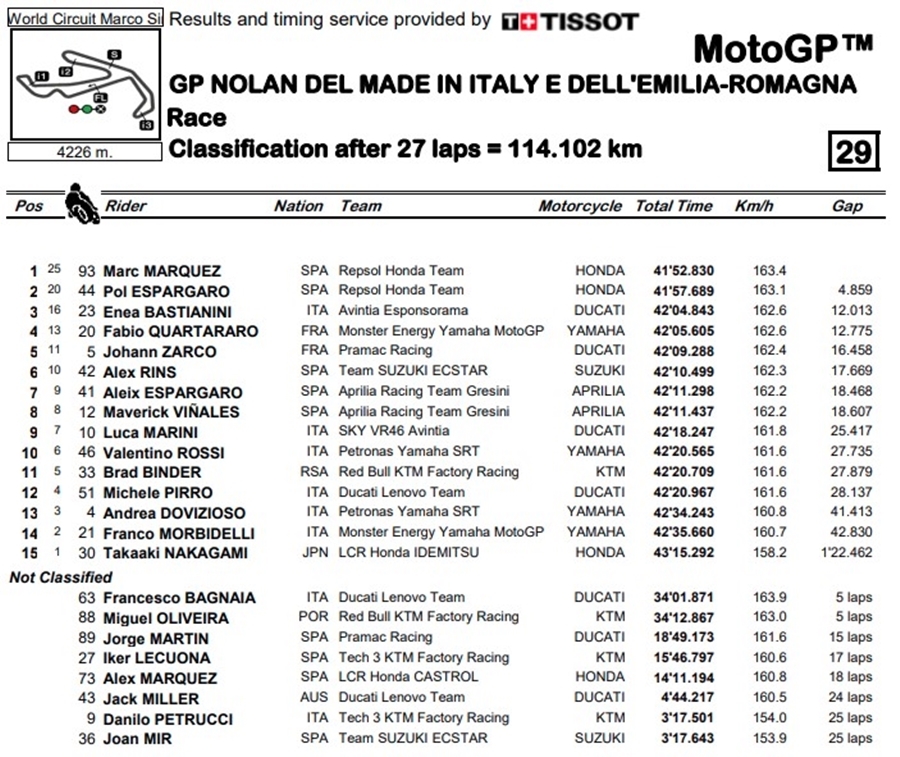 การแข่งขันรายการ Gran Premio Nolan del Made in Italy e dell'Emilia-Romagna ในสนาม Misano World Circuit Marco Simoncelli ในประเทศอิตาลี ในที่สุดก็ได้แชมป์โลกในรุ่น MotoGP เสียที หลัง Francesco Bagnaia จาก Ducati Lenovo Team เกิดพลาดหลุดออกจากการแข่งขันทำให้คะแนนสะสมประจำปีของเขากับ Fabio Quartararo จาก Monster Energy Yamaha MotoGP นั้นกว้างเกินกว่าจะไล่ตามทันใน 2 สนามที่เหลือเลยส่งผลให้  Quartararo คว้าตำแหน่งแชมป์โลกในรุ่น MotoGP 2021 ไปครองได้ ส่วนแชมป์ประจำสนามนี้ตกเป็นของ Marc Marquez จาก Repsol Honda Team ส่วนที่ 2 เป็นเพื่อนร่วมทีมอย่าง Pol Espagaro ที่ขึ้นมาคว้าโพเดี้ยมแรกในสีเสื้อ Honda ด้านที่ 3 Enea Bastianini จาก Avintia Esponsorama ที่สามารถแซง Quartararo ได้ในรอบสุดท้ายนับเป็นโพเดี้ยมที่ 2 ของ Bastianini แต่วันนี้เป็นวันของ Quartararo
