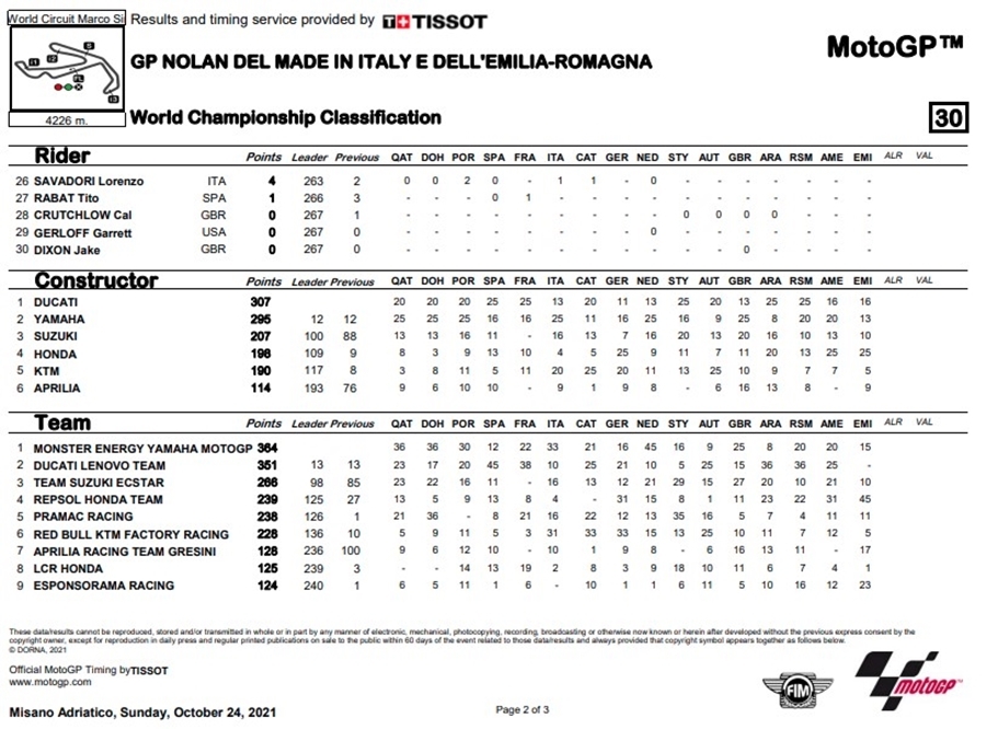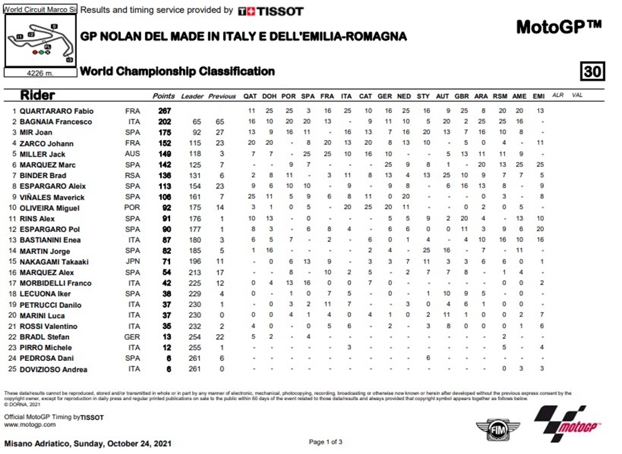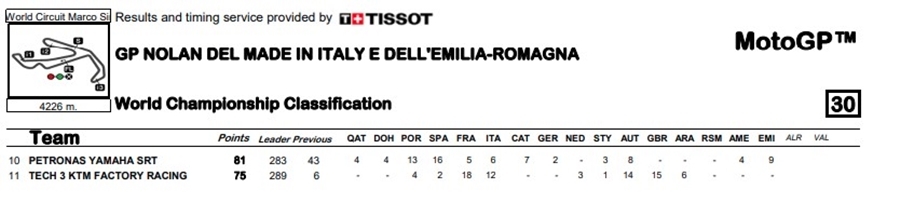 ด้าน Valentino Rossi จาก Petronas Yamaha SRT ถึงแม้จะเข้าเส้นชัยในอันดับที่ 10 ก็ถือว่าเป็นการคว้าแต้มในรุ่น MotoGP ในการแข่งขันครั้งสุดท้ายของเขาบนแผ่นดินอิตาลี ต่อหน้าแฟนๆ ของแชมป์โลก 9 สมัย ท้านที่สุดคือขอแสดงความยินดีกับ Fabio Quartararo จาก Monster Energy Yamaha MotoGP และ Yamaha  ที่มีฤดูกาลที่เหลือเชื่อจนสามารถคว้าแชมป์โลก MotoGP 2021 มาครองได้สำเร็จ