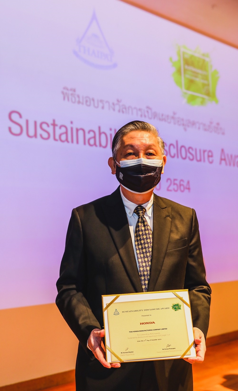 ทั้งนี้ บริษัท ไทยฮอนด้า แมนูแฟคเจอริ่ง จำกัด คือ หนึ่งใน 40 องค์กรชั้นนำที่ได้รับรางวัลเกียรติคุณสูงสุด Sustainability Disclosure Award ประจำปี 2021 ภายใต้ประชาคมการเปิดเผยข้อมูลความยั่งยืนหรือ SDC และเป็นการคว้ารางวัลนี้ได้อย่างต่อเนื่อง 3 ปีซ้อน นับตั้งแต่ปี 2019-2021