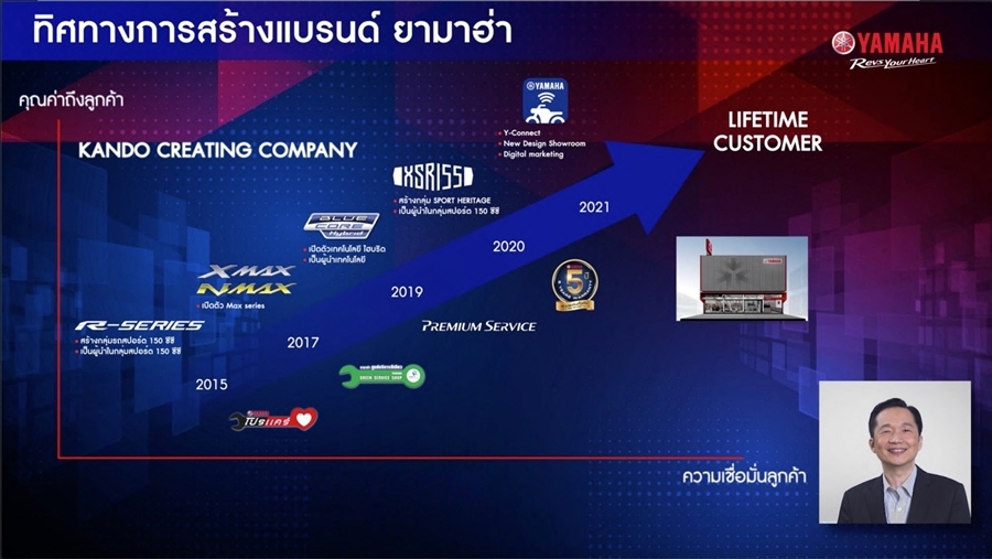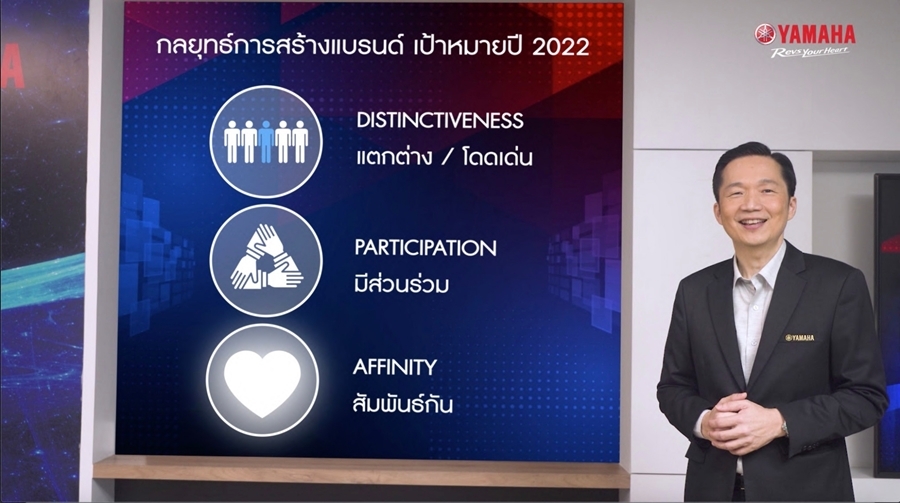 4.) เน้นการสร้างภาพลักษณ์ตราสินค้าที่แข็งแกร่ง เพื่อความยั่งยืนของธุรกิจ รวมถึงการสร้าง Yamaha Lifetime Customers โดยยกระดับคุณภาพทั้งในเรื่องสินค้า การบริการ และกิจกรรมการตลาด ที่พร้อมจะส่งมอบประสบการณ์ชั้นยอด สร้างความแตกต่าง ตอบโจทย์ในทุกไลฟ์สไตล์ของลูกค้า เพื่อให้สินค้าและบริการของยามาฮ่าเป็นที่หนึ่งในใจของลูกค้า และ ทำให้ลูกค้ากลับมาใช้สินค้าและบริการของยามาฮ่าเสมอ