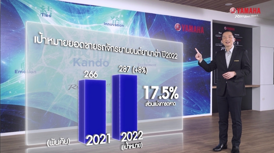 บริษัท ไทยยามาฮ่ามอเตอร์ จำกัด ผู้ผลิตและจำหน่ายรถจักรยานยนต์ ยามาฮ่า ประกาศเดินเกมรุกตลาดรถจักรยานยนต์เมืองไทยในปี 2565 หลังชิงส่วนแบ่งการตลาดเพิ่มเป็น 16.5% ได้สำเร็จในปีที่ผ่านมา ตอกย้ำคุณภาพสินค้ารับประกัน 5 ปี หรือ 50,000 กิโลเมตร สร้างความเชื่อมั่นในตราสินค้าและคุณภาพบริการหลังการขาย เสริมสินค้าใหม่ 4 รุ่น ครอบคลุมทุกการใช้งาน รุกตลาดตั้งเป้า 287,000 คัน หวังขยับส่วนแบ่งการตลาดเพิ่มขึ้นเป็น 17.5% ในปีนี้ พร้อมเดินหน้าปรับโฉมใหม่โชว์รูมจำหน่ายรถจักรยานยนต์ เพื่อสร้างความแตกต่างให้กับตราสินค้า