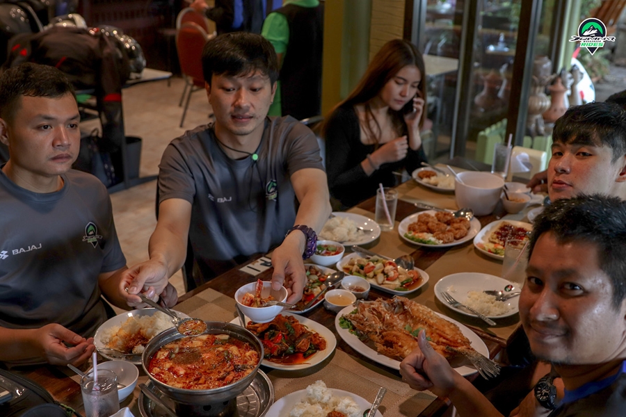 เมื่อล่องแก่งกันอย่างสะใจหมดแรงกันไปเยอะ ถูกเติมเต็มแบบรู้ใจด้วยการฝากท้องที่ร้านช่อชะมวง ร้านอาหารบรรยากาศดีประจำนครนายก ที่ไม่ว่าใครผ่านไปผ่านมาก็รู้จัก งานนี้จัดเต็มอิ่มท้องกันทั้งชาวคณะที่ร่วมกิจกรรม เมื่ออิ่มใจอิ่มท้องกันแล้วก็เคลื่อนขบวน