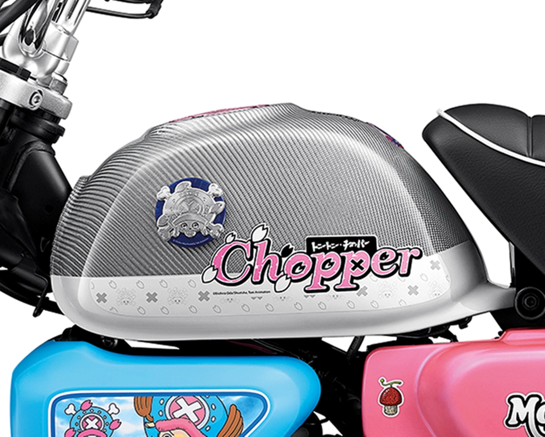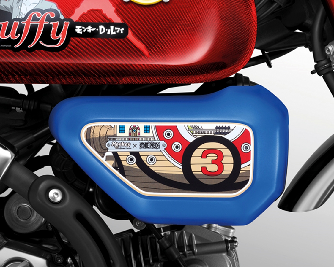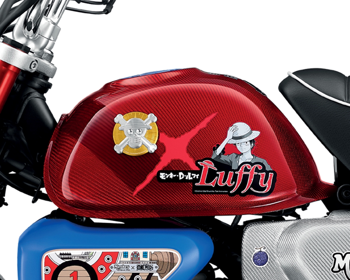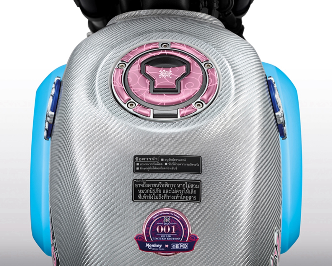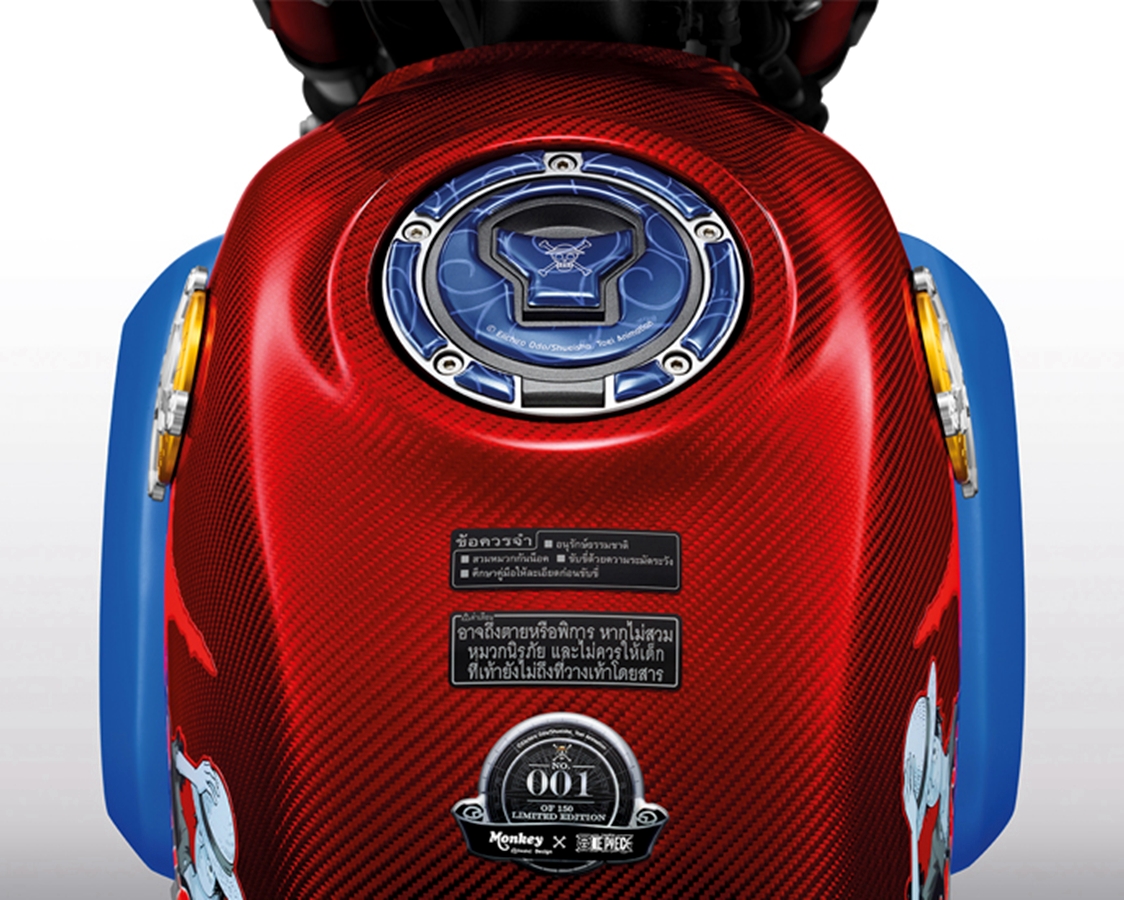 Monkey x One Piece Limited Edition ทั้ง 2 รุ่น ได้รับการออกแบบให้มีความโดดเด่นแบบเฉพาะตัว ถังน้ำมันหุ้มคาร์บอนไฟเบอร์แบบ Double layer มาพร้อม Aluminium Emblem ตราสัญลักษณ์ลิขสิทธิ์แท้จากประเทศญี่ปุ่น ครอบกรองอากาศลวดลายพิเศษ ฝาครอบข้างหุ้มคาร์บอนไฟเบอร์ ปลอกแฮนด์และขอบล้อสีสันแตกต่างไม่เหมือนใคร ฝาถังดีไซน์เฉพาะรุ่น พร้อม Serial Number บ่งบอกความพิเศษด้วยตัวเลข Limited Edition