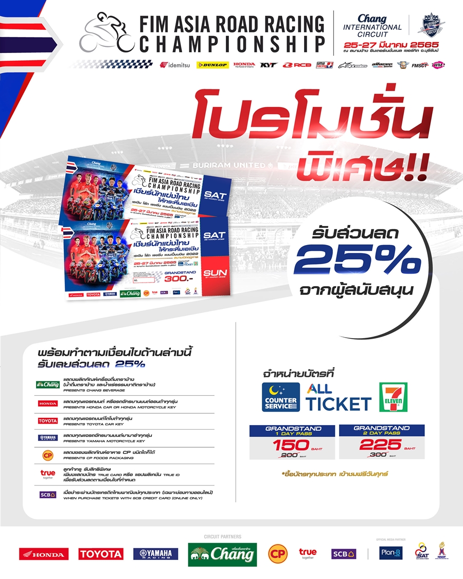แฟนความเร็วที่สนใจชมในสนามแรก วันที่ 25-27 มี.ค.นี้ ซื้อบัตรได้ที่ Counter Service All Ticket ในร้าน 7-Eleven ทุกสาขา บัตร VIP แบบ 1 วัน ราคา 1,000 บาท, 2 วัน 1,500 บาท บัตรแกรนแสตนด์ 1 วัน 200 บาท,2 วัน 300 บาท พิเศษ! รับส่วนลดบัตรแกรนด์สแตนด์ 25% จากผู้สนับสนุนสูงสุด 4 ที่นั่งต่อ 1 ผลิตภัณฑ์ (จำนวนจำกัด) ยกเว้นเครื่องดื่มตราช้างและผลิตภัณฑ์ซีพี รับสิทธิ์สูงสุด 1 ที่นั่งต่อ 1 ผลิตภัณฑ์ ตั้งแต่ 28 กุมภาพันธ์ – 27 มีนาคม 2565 เฉพาะจุดจำหน่ายเท่านั้น สามารถติดตามความเคลื่อนไหว และรายละเอียดส่วนลดจากผู้สนับสนุนได้ในเพจ Chang Circuit Buriram