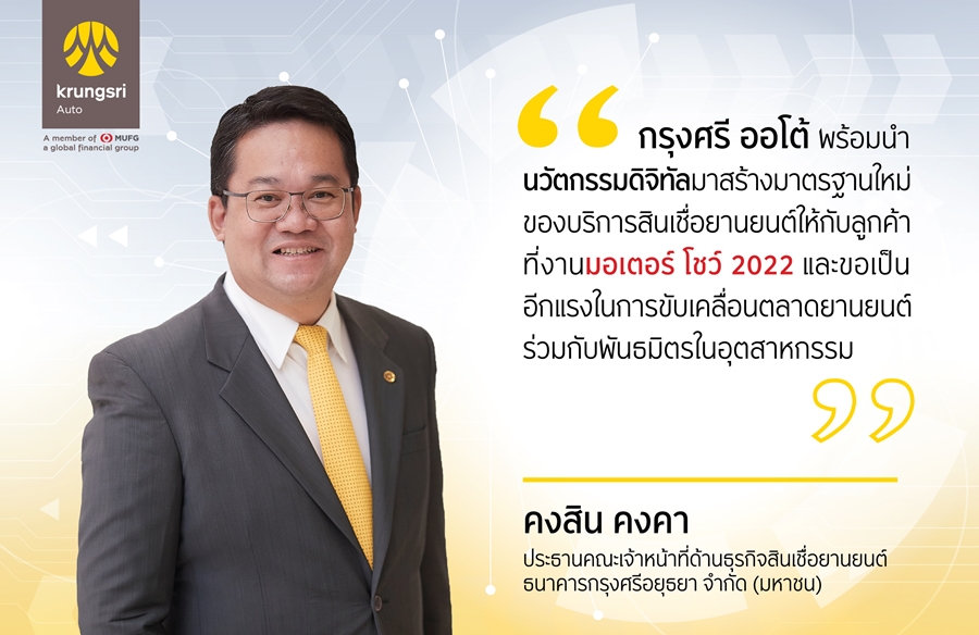 นายคงสิน คงคา ประธานคณะเจ้าหน้าที่ด้านธุรกิจสินเชื่อยานยนต์ ธนาคารกรุงศรีอยุธยา จำกัด (มหาชน) กล่าวว่า “ด้วยความมุ่งมั่นพัฒนานวัตกรรมเพื่อยกระดับบริการสินเชื่อยานยนต์ กรุงศรี ออโต้ ได้เดินหน้านำเทคโนโลยีมาสร้างประสบการณ์ใหม่ให้แก่ลูกค้าอย่างต่อเนื่อง รวมถึงการให้บริการในงานมอเตอร์โชว์ ตลอด 12 ปีที่ผ่านมา ในปีนี้ กรุงศรี ออโต้ ได้นำนวัตกรรมสินเชื่อยานยนต์ดิจิทัล บน GO Application by Krungsri Auto พร้อมการอนุมัติวงเงินตามรายบุคคล (Customer-based Lending) ซึ่งจะช่วยให้ลูกค้าขอสินเชื่อได้โดยไม่ต้องใช้เอกสาร รวมถึงสามารถเลือกซื้อรถได้ตามความต้องการและศักยภาพของตนเอง”