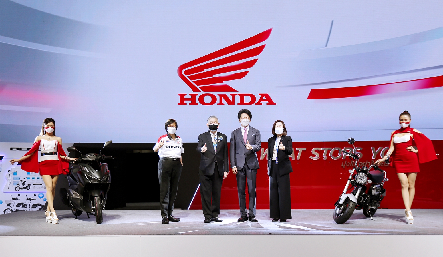 “ในงานครั้งนี้ เรามาพร้อมกับการเปิดรถรุ่นใหม่ครบทุกเซกเมนท์รวมถึง 4 รุ่น นำโดย All New Click160 รถสปอร์ต เอ.ที. ที่ได้รับการพัฒนาขึ้นใหม่ทั้งคัน ผสานความแรงและความโฉบเฉี่ยวขั้นสุดไว้ด้วยกัน โดยมี เจ-ชนาธิป สรงกระสินธ์ ซูเปอร์สตาร์ลูกหนังชาวไทยในเจลีกเป็นพรีเซนเตอร์ผู้ถ่ายทอด DNA ของความเป็นผู้นำจ่าฝูง ตามมาด้วย New Dax125 ที่มีคาแรกเตอร์พิเศษไม่เหมือนใครด้วยเฟรมแบบ T-Bone และรถบิ๊กไบค์ 2 รุ่นประกอบด้วย New NT1100 โมเดลสปอร์ตทัวริ่งรุ่นใหม่ล่าสุด และ New GOLDWING รุ่นพิเศษ Black Edition รถทัวริ่งระดับท็อปคลาส นอกเหนือจาก 4 รุ่นนี้แล้ว ในงานนี้ยังเป็นครั้งแรกที่คนไทยจะได้สัมผัสกับตัวจริงของ New ADV350 รถ Premium SUV Bike ที่กำลังมาแรงที่สุดในขณะนี้”