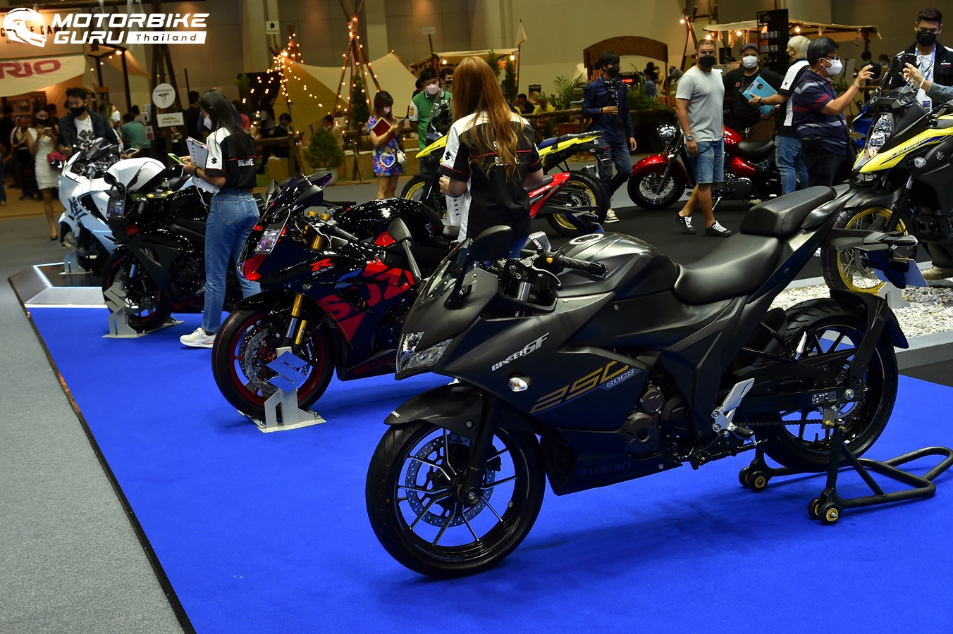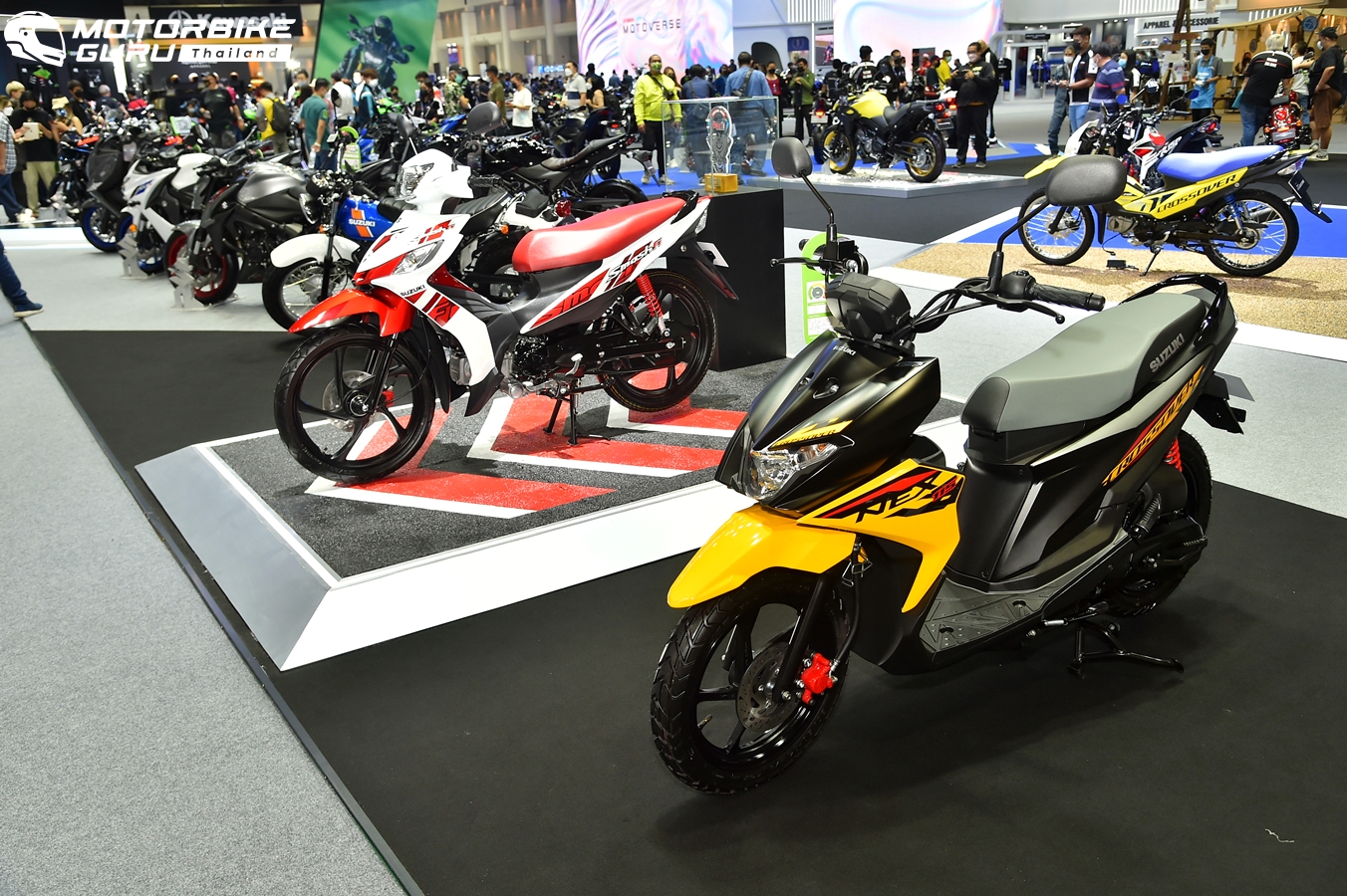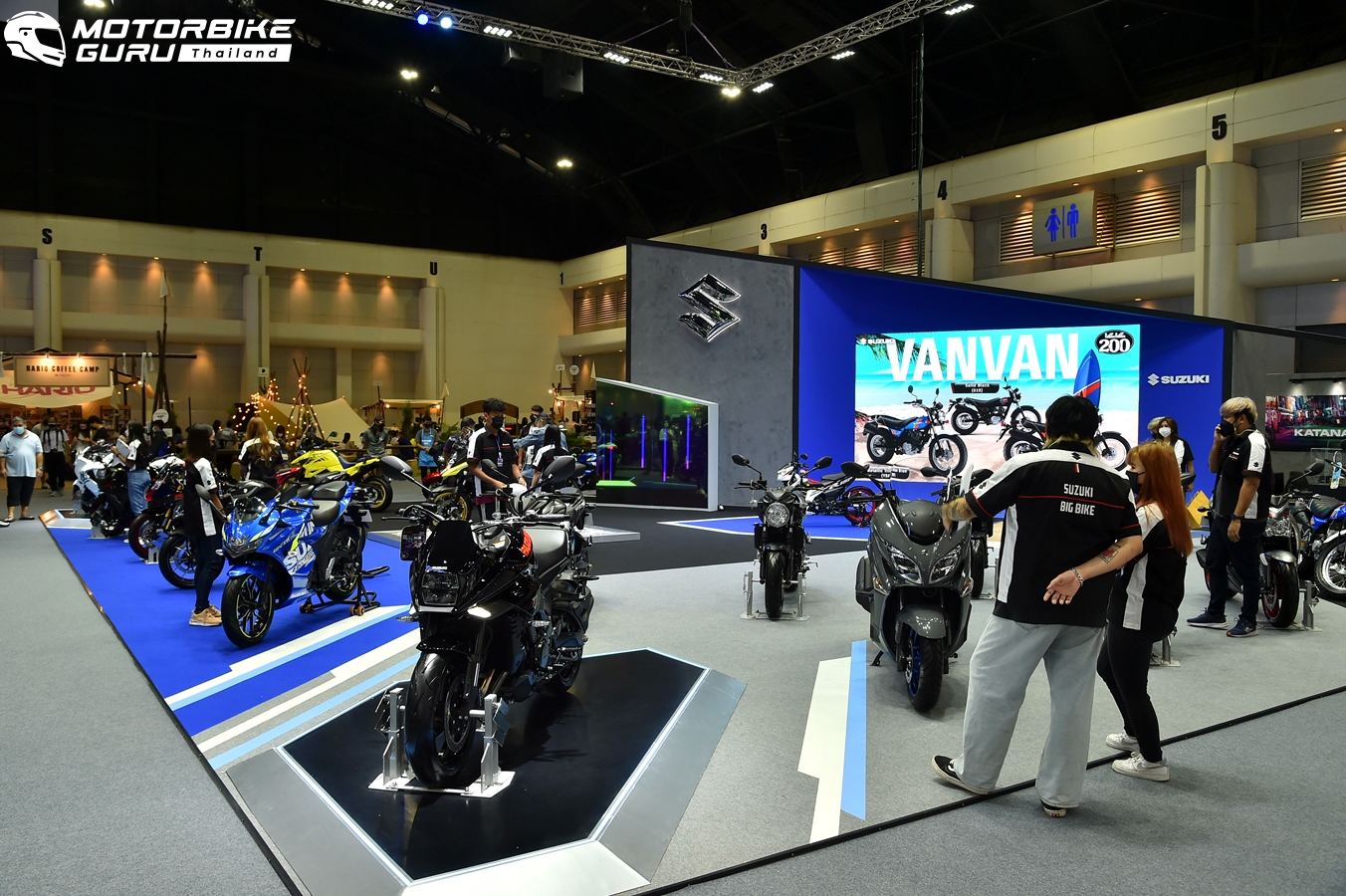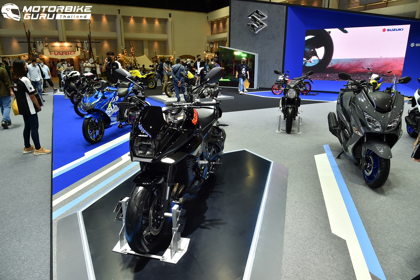 ภายในบูธ ซูซูกิ แบ่งโซนจัดแสดง 5 แอเรีย ได้แก่ Suzuki Sport Area, Suzuki Street Area, Suzuki Adventure Area และ Suzuki Convenience Area พร้อมให้สัมผัสกับความหลากหลาย เช่น All New Suzuki Hayabusa ที่ทำความเร็วถึง 300 กิโลเมตรต่อชั่วโมงครั้งแรกของโลก , Suzuki GSX-R1000R สปอร์ตไบค์ที่ถูกถ่ายทอดเทคโนโลยีโดยตรงมาจาก MotoGP, สกู๊ตเตอร์ระดับพรีเมี่ยม New Suzuki Burgman 400, New Suzuki V-Strom 650XT และรถจักรยานยนต์ครอบครัวสุดประหยัดน้ำมัน New Suzuki Smash Fi