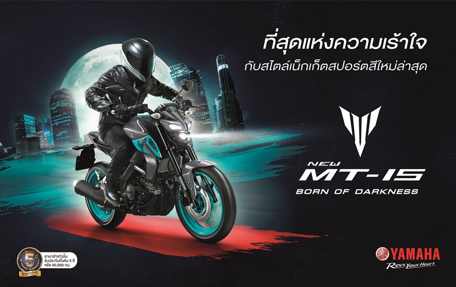 NEW YAMAHA MT-15…BORN OF DARKNESS มาพร้อมสีสัน 3 เฉดสีใหม่! คือ สีเทา Metallic Gray, สีน้ำเงิน Racing Blue และ สีดำ Matt Black โดยสีของล้อแม็กและลายกราฟฟิคจะดีไซน์ให้เป็นสีเดียวกัน พร้อมวางจำหน่ายในราคา