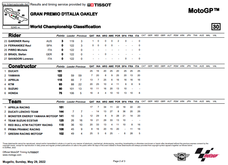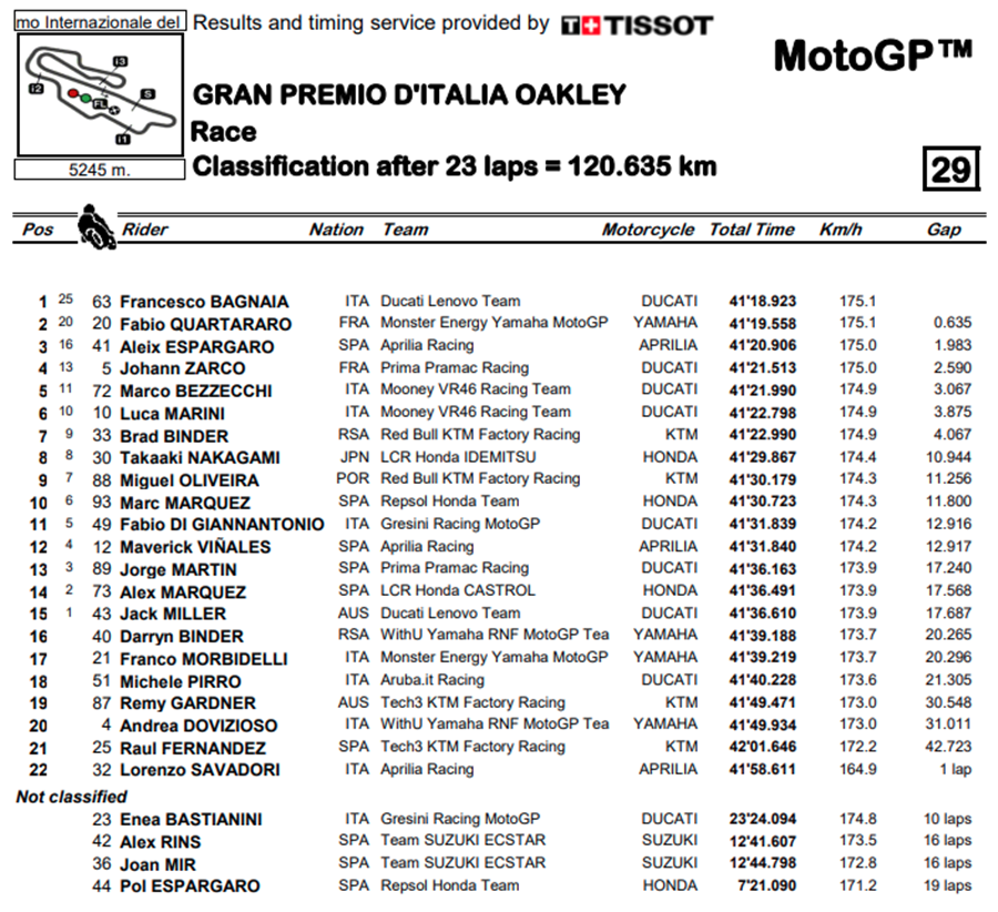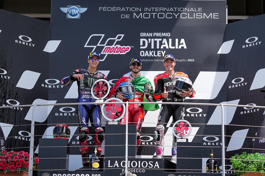 Francesco Bagnaia ของทีม Ducati Lenovo Team คว้าชัยได้ใน Gran Premio d’Italia Oakley ที่สนาม Autodromo Internazionale del Mugello ถึงแม้ว่าอันดับจะตกไปอยู่ถึงที่ 10 แต่ก็ค่อยๆ ไต่อันดับขึ้นมาจนเป็นผู้ชนะการแข่งขันในที่สุด เป็นการคว้า 25 แต้มสำคัญ เพื่อกลับมามีลุ้นในคะแนนสะสมชิงแชมป์โลก