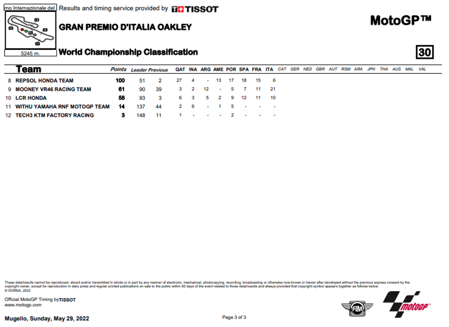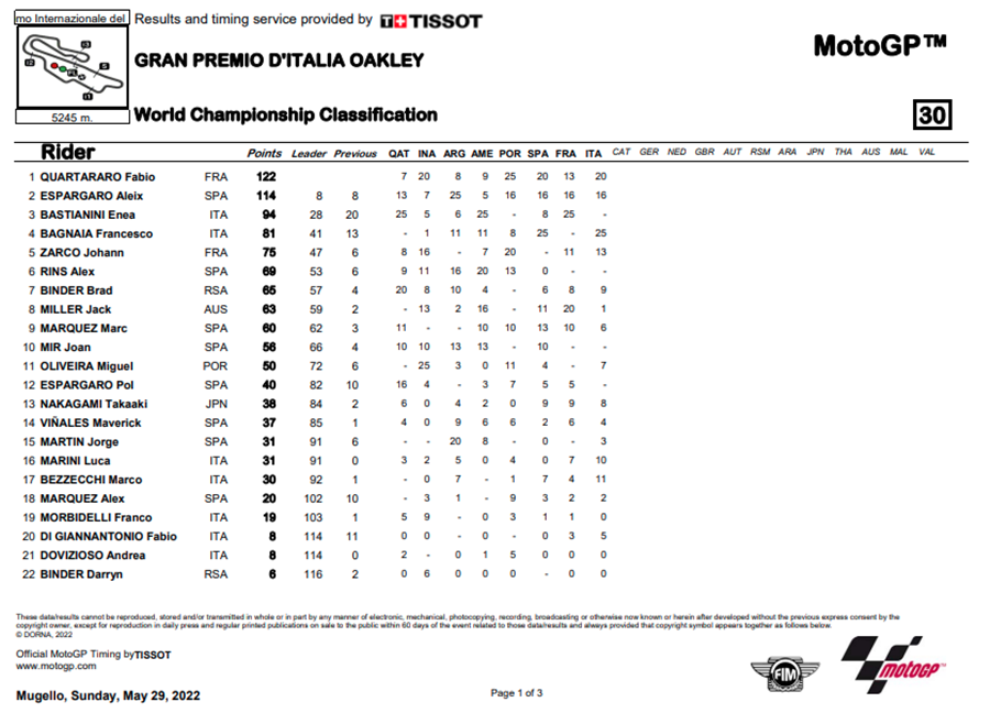Quartararo เป็นผู้นำคะแนนสะสม แต่ก็มี Aleix Espargaro ตามมาโดยแต้มห่างกันเพียง 8 แต้มเท่านั้น ส่วน Bastianini การพลาดออกจากการแข่งขันทำให้พลาดคะแนนไปทำให้ตอนนี้คะแนนห่างถึง 28 แต้ม ส่วนชัยชนะของ Bagnaia ทำให้เขากระโดดขึ้นไปอยู่อันดับที่ 4 การแข่งขันรอบถัดไปจัดขึ้นที่ Circuit de Barcelona-Catalunya ในรายการ Gran Premi Monster Energy de Catalunya ในสัปดาห์หน้า