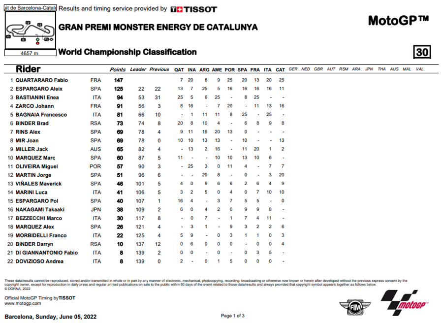 การแข่งขัน MotoGP ในสนามที่ 9 รายการ Gran Premi Monster Energy de Catalunya ที่สนาม Circuit de Barcelona-Catalunya ในสเปน เป็นสนามที่มีเรื่องดราม่าเกิดขึ้นมากมาย แต่สุดท้ายก็เป็น Fabio Quartararo จาก Monster Energy Yamaha MotoGP ที่สามารถคว้าชัยชนะอันสมบูรณ์แบบ แถมทำคะแนนสะสมทิ้งห่างออกไปถึง 22 คะแนน ส่วน Jorge Martin และ Johann Zarco จาก Prima Pramac Racing คว้าโพเดียมได้สำเร็จหลังจากความผิดพลาดอันน่าเหลือเชื่อของ Aleix Espargaro จาก Aprilia Racing จากการเข้าใจผิดในการนับรอบการแข่งขันทำให้อันดับตกลงไปถึงที่ 5