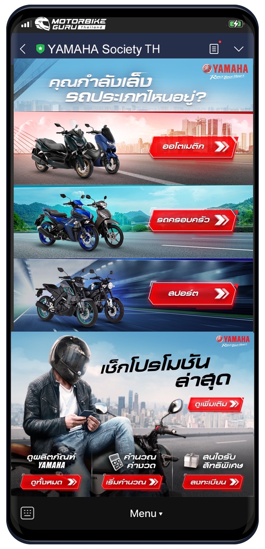 สำหรับลูกค้าที่สนใจรถจักรยานยนต์ยามาฮ่า ช่องทาง Line Official Account "YAMAHA Society TH" นี้ จะอัปเดทข้อมูลรุ่นรถจักรยานยนต์ยามาฮ่าที่ตรงกับความสนใจของคุณได้ดียิ่งขึ้น เพื่อให้ง่ายต่อการค้นหาข้อมูลประกอบการตัดสินใจ พร้อมรวบรวมดีลราคาพิเศษและข้อมูลอื่นๆ ที่เข้าถึงง่ายผ่านเมนูในไลน์เพียงคลิกเดียว