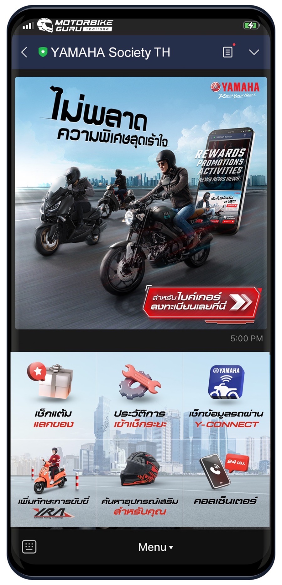 Line Official Account "YAMAHA Society TH" ตอกย้ำการเข้าสู่โลกดิจิทัลอย่างเต็มตัวของยามาฮ่า เพื่อเพิ่มศักยภาพในการสื่อสารกับลูกค้ายามาฮ่า และผู้ที่สนใจรถจักรยานยนต์รุ่นต่างๆ ได้อย่างตรงกลุ่มเป้าหมาย อีกทั้งเป็นเครื่องมือในการเพิ่มประสิทธิภาพในการทำการขาย และการตลาดแบบครบทุกกระบวนการของธุรกิจ (All in one platform) โดยเริ่มเปิดใช้งานในวันที่ 21 มิถุนายน นี้ พร้อมมีกิจกรรม และรายการส่งเสริมการขายให้ลูกค้าได้ร่วมสนุกมากมาย