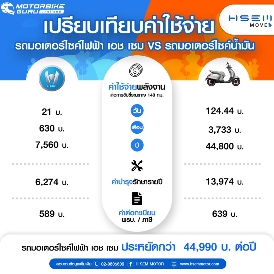 เพื่อให้เห็นภาพที่ชัดขึ้น เอช เซม ให้ทีมเปรียบเทียบค่าใช้จ่ายการใช้มอเตอร์ไซค์ไฟฟ้า เอช เซม กับ มอเตอร์ไซค์เครื่องยนต์ทั่วไป ผลออกมาว่า รถมอเตอร์ไซค์ไฟฟ้าเอช เซม ช่วยประหยัดค่าใช้จ่ายได้กว่า44,990 บาท/ปี (ตามภาพ) ซึ่งหากธุรกิจมีการใช้จำนวนมากก็จะคุ้มค่าและประหยัดค่าใช้จ่ายได้มากเช่นกัน