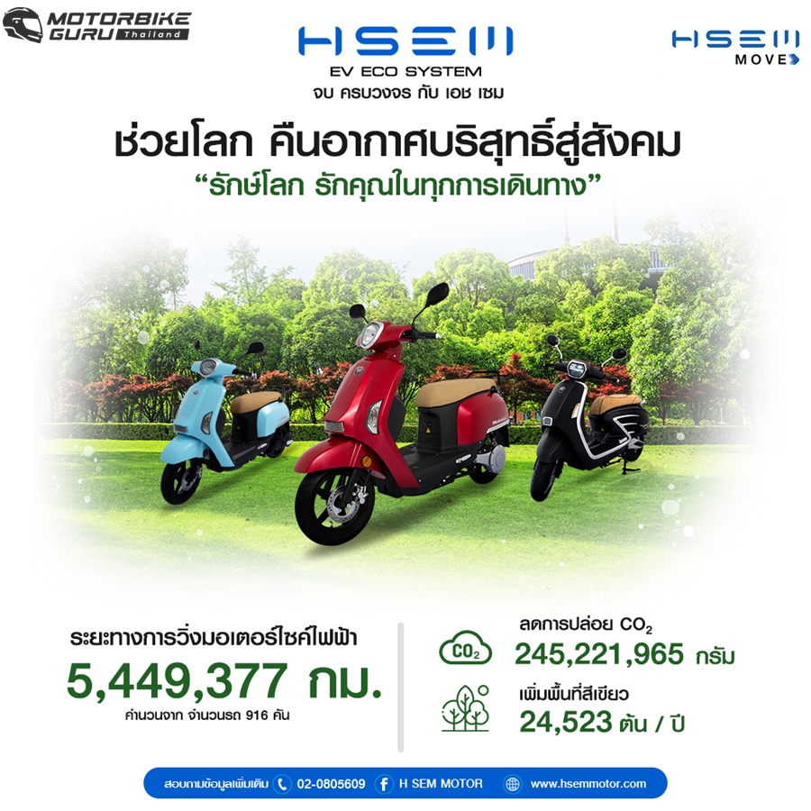 นอกจากความคุ้มค่าในเรื่องค่าใช้จ่ายแล้ว อากาศสะอาดเป็นอีกหนึ่งความคุ้มค่าที่สังคมและโลกเราจะได้รับ จากการรวบรวมข้อมูลการขับขี่ของมอเตอร์ไซค์ไฟฟ้าของเอช เซม รวมระยะทางทั้งหมด 5,449,377 กิโลเมตร ช่วยลดการปล่อยสารคาร์บอนไดออกไซด์ออกสู่อากาศได้ถึง 245,221,965 กรัม หรือเทียบเท่ากับการปลูกต้นไม้จำนวน 24,523 ต้น/ปี ไม่น้อยทีเดียว และหากธุรกิจต่างๆหันมาใช้รถมอเตอร์ไซค์ไฟฟ้ากันมากๆ อากาศสะอาดจะอยู่กับพวกเราตลอดไป