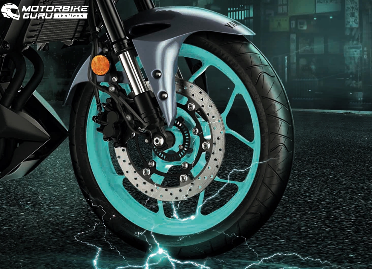 ถังน้ำมันรูปทรงใหม่ เท่ ดุดัน สไตล์ Big Bike สะท้อนเอกลักษณ์ MT-Series ให้ความกระชับในการขับขี่ยิ่งขึ้น, โช้คหน้า TELESCOPIC แบบ UPSIDE DOWN เพิ่มสมรรถนะการทรงตัว ซับแรงสั่นสะเทือนที่ดีขึ้นทั้งในช่วงทางตรงและทางโค้ง พร้อมหยุดรถได้อย่างมั่นใจในทุกสถานการณ์ด้วยระบบเบรก ABS