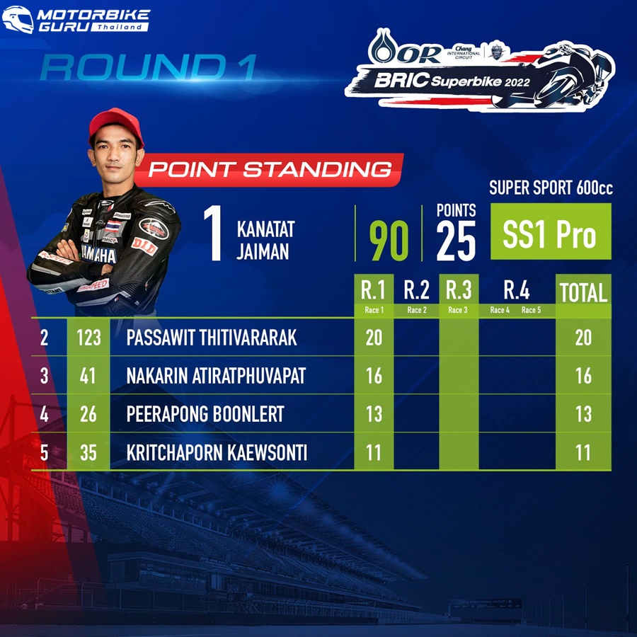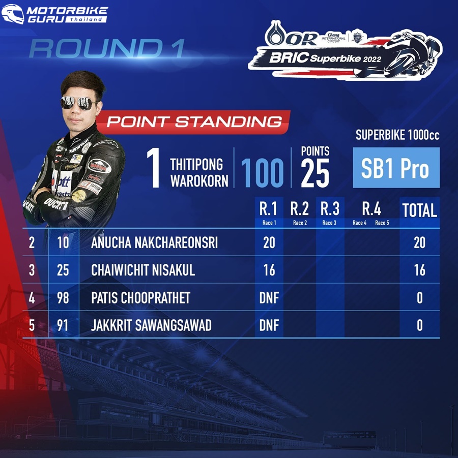 สำหรับสถานการณ์ล่าสุดบนตารางคะแนนสะสมก่อนเข้าสู่สนาม 2 ในสุดสัปดาห์นี้ ติ๊งโน๊ต-ฐิติพงศ์ วโรกร จาก พีเอสจีเอ ดูคาติ พีทีที ลูบริแคนต์ นก จูนเนอร์ ติ๊งโน๊ต รั้งจ่าฝูงในรุ่น ซูเปอร์ไบค์ 1,000 ซีซี (SB1Pro, SB1, SB2) มีทั้งสิ้น 25 คะแนน ตามด้วยคู่แข่งคนสำคัญอย่าง ซุป-อนุชา นาคเจริญศรี คู่แข่งจาก ยามาฮ่า บริดจสโตน อนุชา เรซซิ่ง ทีม ในอันดับ 2 มี 20 คะแนน ส่วนอันดับ 3 ซีเค-ชัยวิชิต นิสกุล จาก จอมไทย แฮปปี้ โฮม โมโตเร็กซ์ บริดจสโตน เรซซิ่ง ทีม มีทั้งสิ้น 16 คะแนน