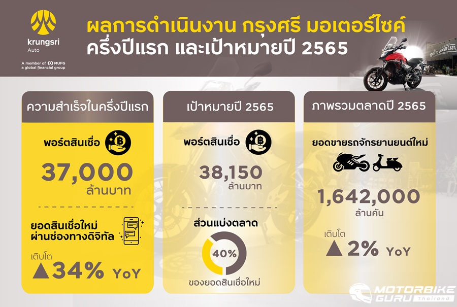 นางสาวชญาน์ธิป กล่าวเสริมว่า “สำหรับในครึ่งหลังของปี 2565 เรามองว่าตลาดรถจักรยานยนต์จะเติบโตได้ต่อไป จากการบริโภคภาคเอกชนที่มีแนวโน้มฟื้นตัวต่อเนื่องและรายได้ครัวเรือนที่ปรับตัวดีขึ้น โดยคาดว่ายอดขายรถจักรยานยนต์ทั้งปีจะอยู่ที่ 1,642,000 คัน หรือคิดเป็นอัตราการเติบโต 2% อย่างไรก็ดี สถานการณ์เศรษฐกิจโดยรวมยังคงมีความไม่แน่นอนสูง กรุงศรี มอเตอร์ไซค์ จึงพร้อมทำงานอย่างใกล้ชิดกับพันธมิตรธุรกิจทุกราย โดยอาศัยความเข้าใจกลุ่มลูกค้าที่หลากหลาย การวิเคราะห์ข้อมูลเชิงลึก และโซลูชันสินเชื่อรถจักรยานยนต์ที่ครบวงจรที่สุดในตลาด ทั้งสำหรับลูกค้ารายย่อยและผู้แทนจำหน่ายรถจักรยานยนต์ (อินเวนทอรี่ ไฟแนนซ์) รวมทั้งตอบสนองความต้องการด้านยานยนต์ไฟฟ้าของกลุ่มผู้บริโภคยุคใหม่ ผ่านการให้บริการสินเชื่อรถจักรยานยนต์ไฟฟ้า โดยกรุงศรี มอเตอร์ไซค์ ถือเป็นแบรนด์แรกในตลาดที่รุกเซกเมนต์นี้อย่างจริงจัง และเป็นแบรนด์เดียวที่ให้บริการสินเชื่อมอเตอร์ไซค์ไฟฟ้าแก่ทุกรุ่น ทุกแบรนด์ เพื่อส่งเสริมให้ผู้ใช้รถมีชีวิตที่ดีขึ้น และขับเคลื่อนการเติบโตอย่างมีเสถียรภาพของอุตสาหกรรมในภาพรวม”
