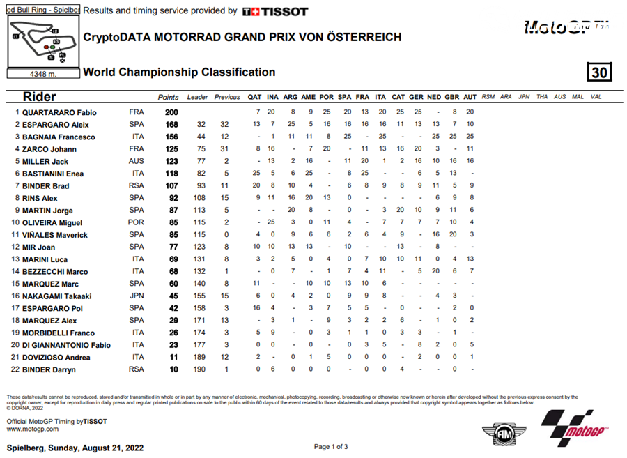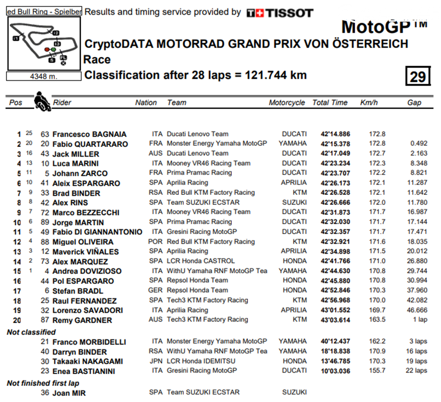 Francesco Bagnaia จาก Ducati Lenovo Team คว้าชัยในได้รายการ CryptoDATA Motorrad Grand Prix von Österreich ที่สนาม Red Bull Ring - Spielberg ในออสเตรีย โดยมี Fabio Quartararo จาก Monster Energy Yamaha MotoGP ผู้นำคะแนนสะสมประจำปี ตามมาเป็นอันดับที่ 2 ที่สามารถแซง Jack Miller จาก Ducati Lenovo Team ขึ้นมาได้แม้สนามนี้จะเข้าทางกับรถ Ducati มากกว่า Ysmaha ก็ตาม