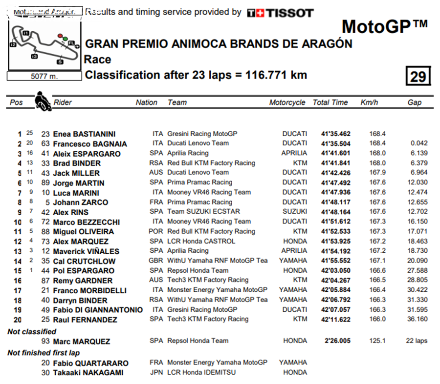 Enea Bastianini จาก Gresini Racing MotoGP สามารถเอาชนะ Francesco Bagnaia จาก Ducati Lenovo Team โดยทิ้งห่างเพียง 0.042 วินาที ในการแข่งขันรายการ Gran Premio Animoca Brands de Aragon