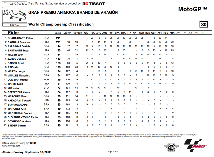 และ Takaki Nakagami จาก LCR Honda IDEMITSU ด้าน Marc Marquez ถึงแม้จะไม่ล้มแต่ก็ต้องเข้าพิทและออกจากการแข่งขันไปเนื่องจากมีชิ้นส่วนของรถ Quartararo ติดมาและทำให้รถของ Marc Marquez ได้รับความเสียหาย ถือว่าปิดฉากอย่างไวสำหรับแฟนๆ ของนักแข่งทั้ง 2 คน หลังการแข่งขันครั้งนี้ทำให้คะแนนสะสมของ Bagnaia ตามหลัง Quartararo เพียง 10 คะแนน โดยมีการแข่งขันเหลืออีกเพียง 5 สนามเท่านั้น