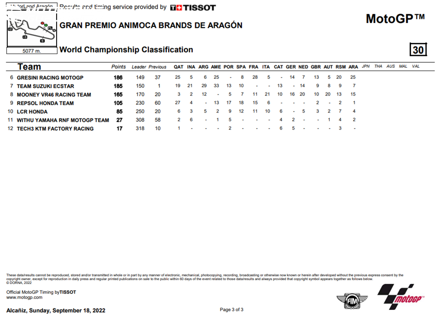 ผ่านการแข่งขัน 2 เรซที่ “ก๊องส์” ธัชกร ขยับขึ้นไปรั้งอันดับ 5 บนตารางแชมเปี้ยนชิพ เก็บเพิ่มเป็น 124 คะแนน โดยสนามถัดไปซึ่งเป็นสนามสุดท้ายของฤดูกาล จะโยกไปดวลความเร็วกันที่ เซอร์กิต ริคาร์โด ตอร์โม เมืองบาเลนเซีย ประเทศสเปน ระหว่างวันที่ 5-6 พฤศจิกายนนี้