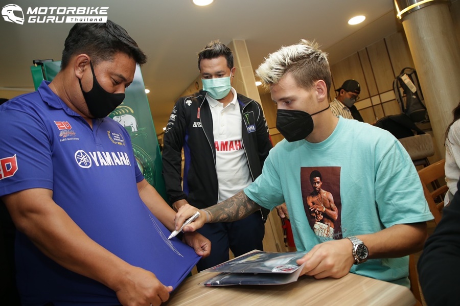 นายพงศธร เอื้อมงคลชัย รองประธานกรรมการบริหาร, นายภาณุพล กิตติคำรณ รองผู้จัดการใหญ่ด้านการขายและการตลาด, นางสาวบัวทิพย์ จันทร์ดำรงกุล รองผู้จัดการใหญ่ด้านวางแผนการค้า บริษัท ไทยยามาฮ่ามอเตอร์ จำกัด พร้อมนักแข่งในสังกัด ยามาฮ่า ไทยแลนด์ เรซซิ่งทีม ให้การต้อนรับ ฟาบิโอ กวาร์ตาราโร แชมป์โลกโมโตจีพีคนปัจจุบัน และคู่หู ฟรังโก มอร์บิเดลลี คู่หูนักแข่งในสังกัด มอนสเตอร์ เอเนอร์จี้ ยามาฮ่า โมโตจีพีทีม